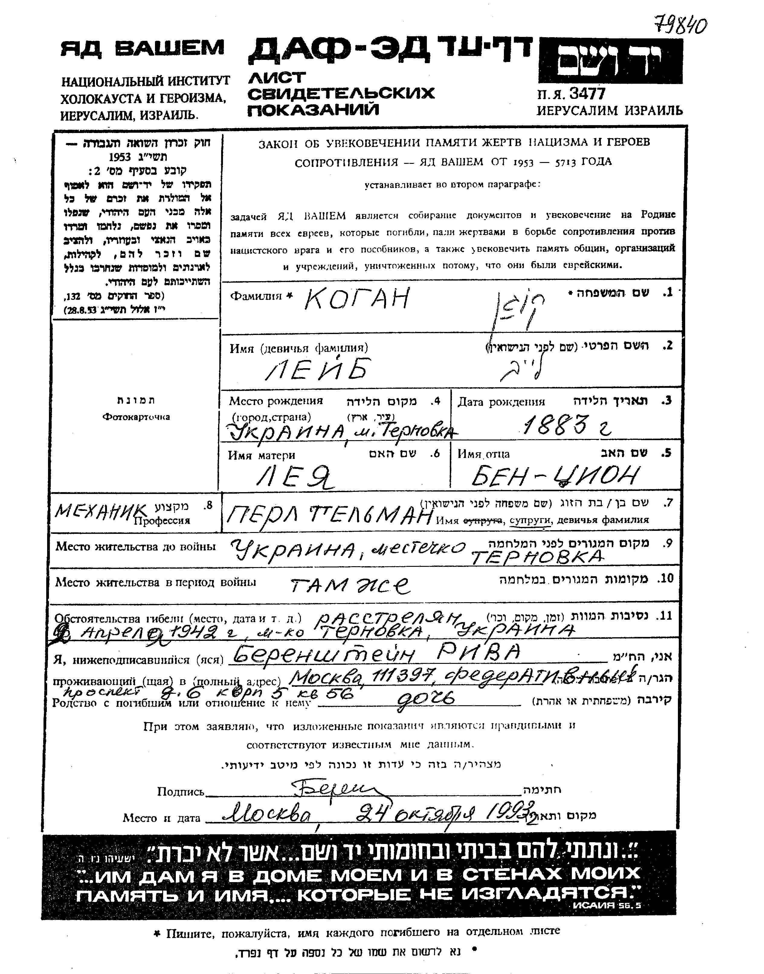 Leib Kogan wurde im Jahr 1883 in Ternovka, Ukraine (UdSSR) geboren. Er war der Sohn von Ben Bentzion und Lea. Er war Mechaniker/-in und mit Perl Verheiratet. Vor dem Zweiten Weltkrieg lebte er in Ternovka, Ukraine (UdSSR). Während des Krieges war er in Ternovka, Ukraine (UdSSR).