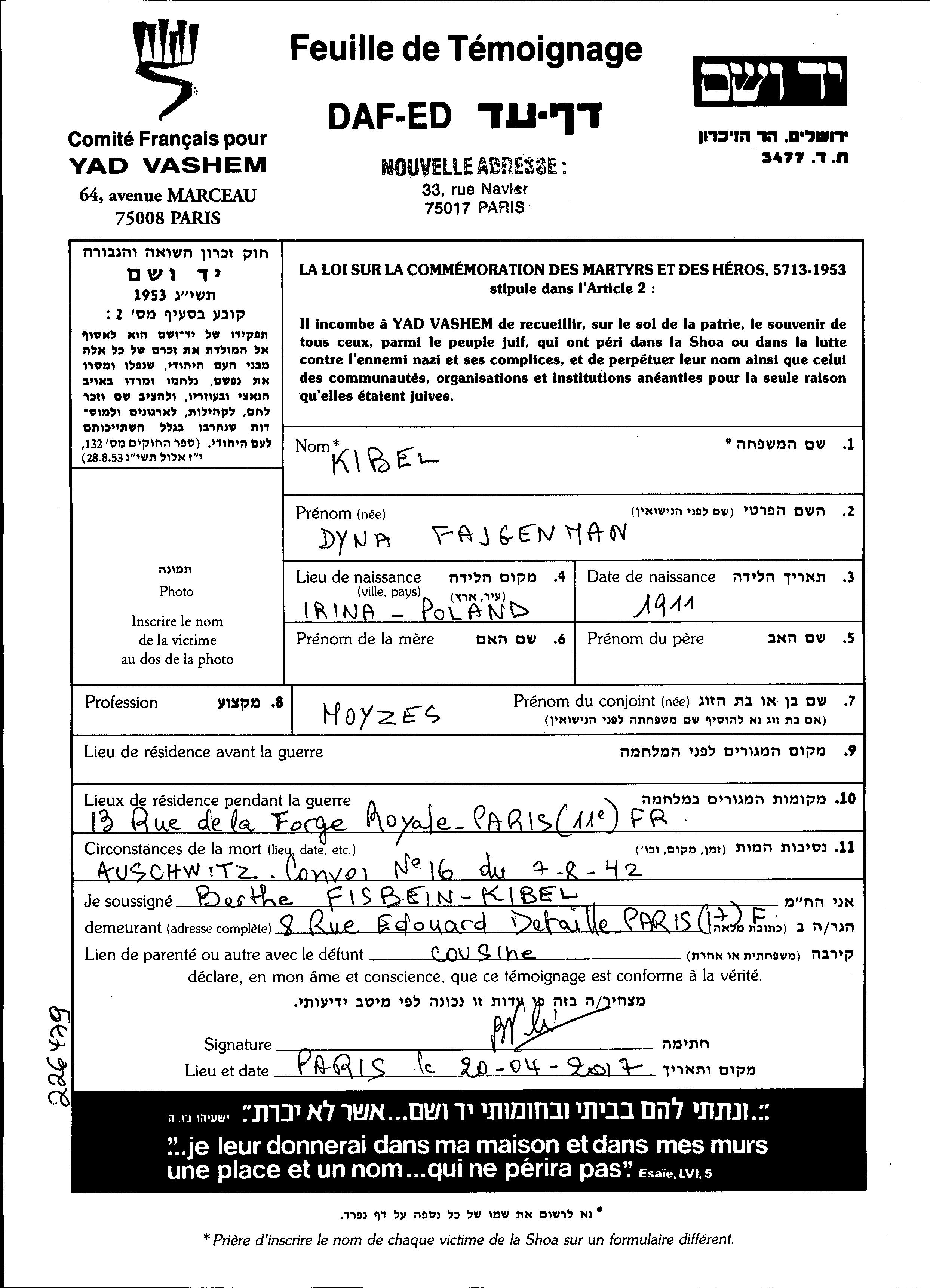 Dyna Kibel, geb. Fajgenman wurde im Jahr 1911 in Irina, Poland geboren. Sie war mit Moyzes Verheiratet. Vor dem Zweiten Weltkrieg lebte sie in Paris, Frankreich.