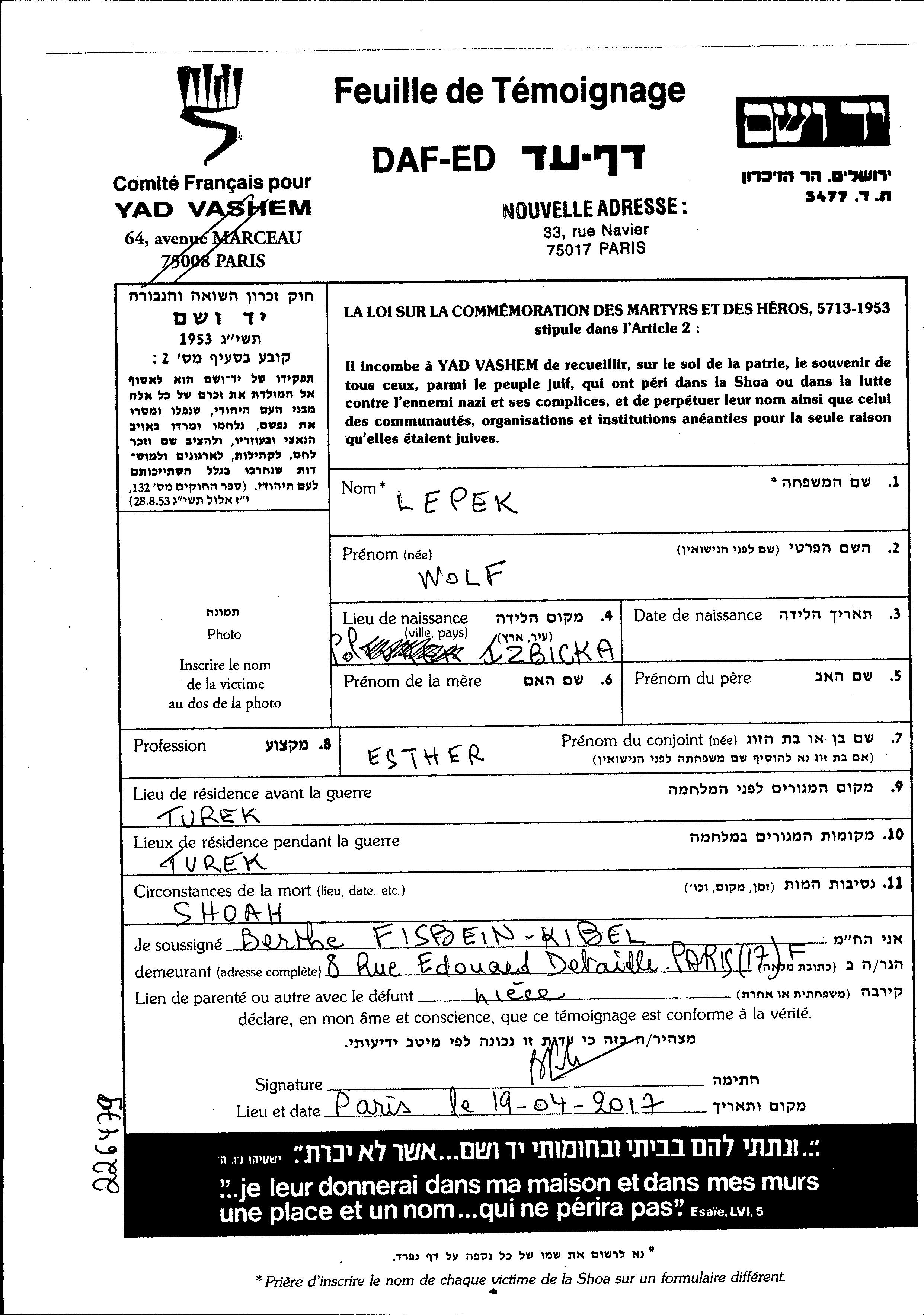 Wolf Lepek wurde in Izbica, Polen geboren. Er war mit Esther Verheiratet. Vor dem Zweiten Weltkrieg lebte er in Turek, Polen. Während des Krieges war er in Turek, Polen.