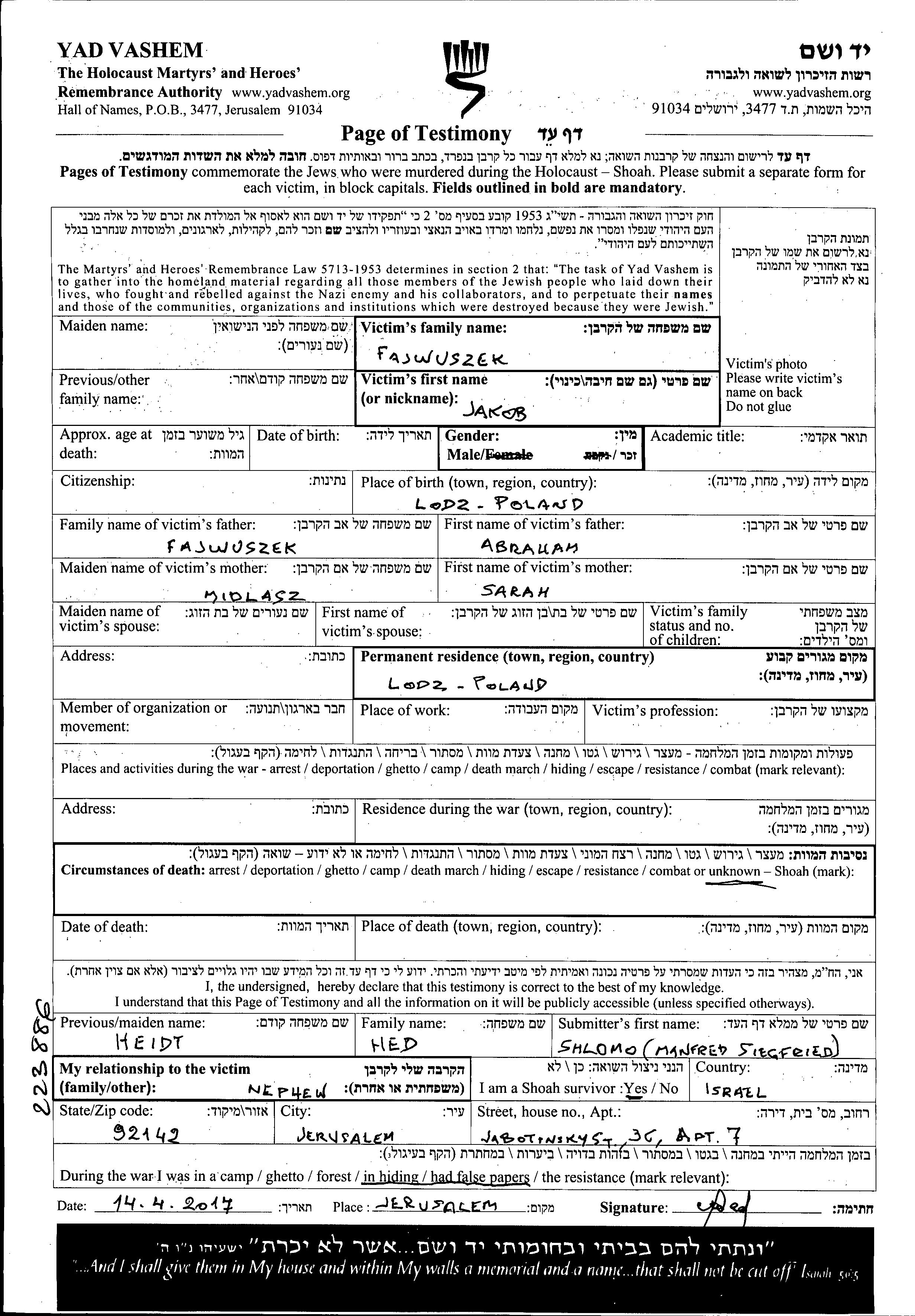 Jakob Fajwuszek wurde in Lodz, Polen geboren. Er war der Sohn von Abraham und Sarah, geb. Midlasz. Vor dem Zweiten Weltkrieg lebte er in Lodz, Polen.
