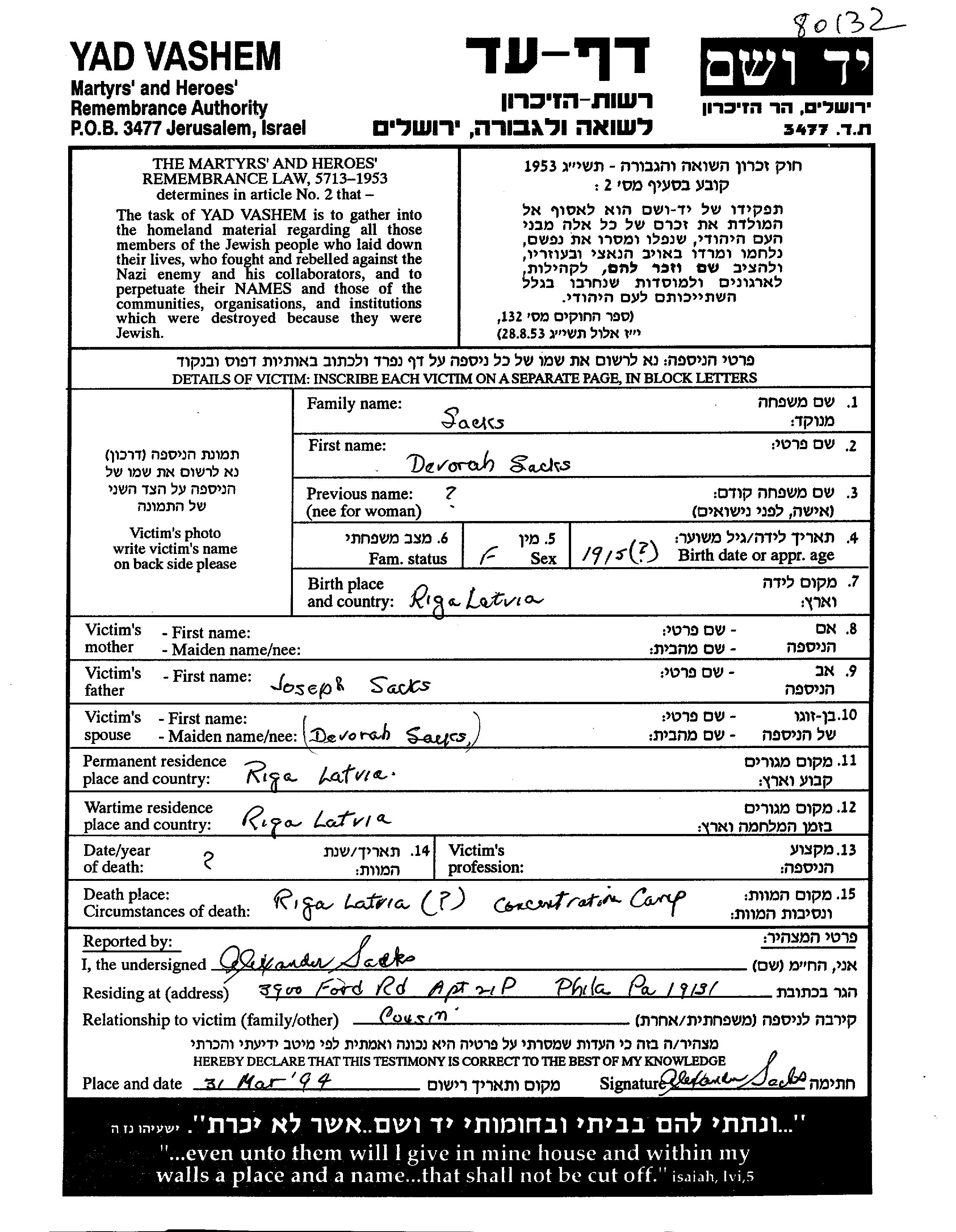 Devorah Sacks wurde im Jahr 1915 in Riga, Lettland geboren. Sie war die Tochter von Joseph. Vor dem Zweiten Weltkrieg lebte sie in Riga, Lettland. Während des Krieges war sie in Riga, Lettland.
