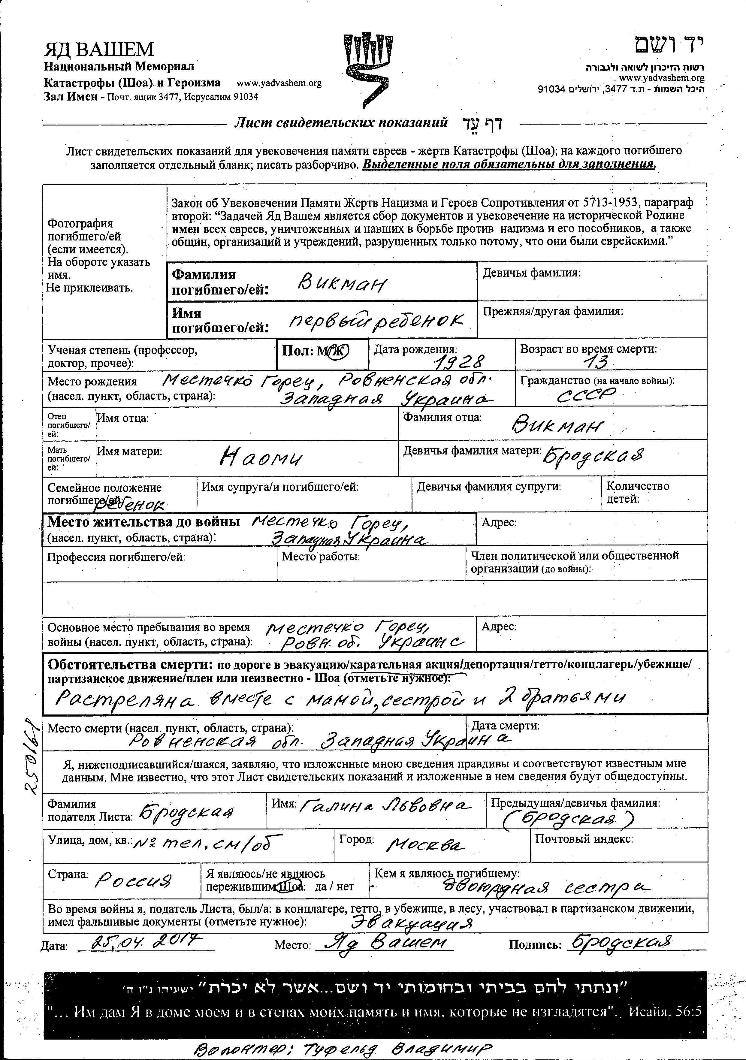 Vorname unbekannt Vikman wurde im Jahr 1928 in Turzysk, Polen geboren. Sie war die Tochter von Naomi, geb. Brodskaya. Sie war Jugendliche/-r. Vor dem Zweiten Weltkrieg lebte sie in Turzysk, Polen. Während des Krieges war sie in Turzysk, Polen.