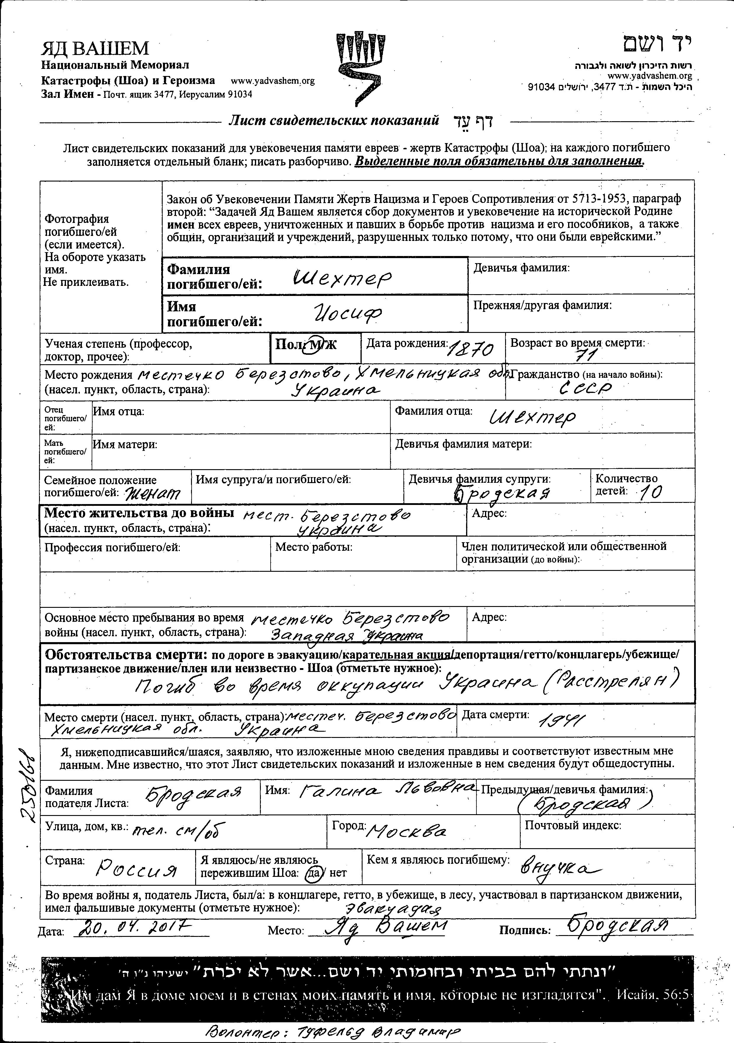 Iosif wurde in der Schoah ermordet. Todesort: Berezdov, Ukraine (UdSSR) im Jahr 1941.