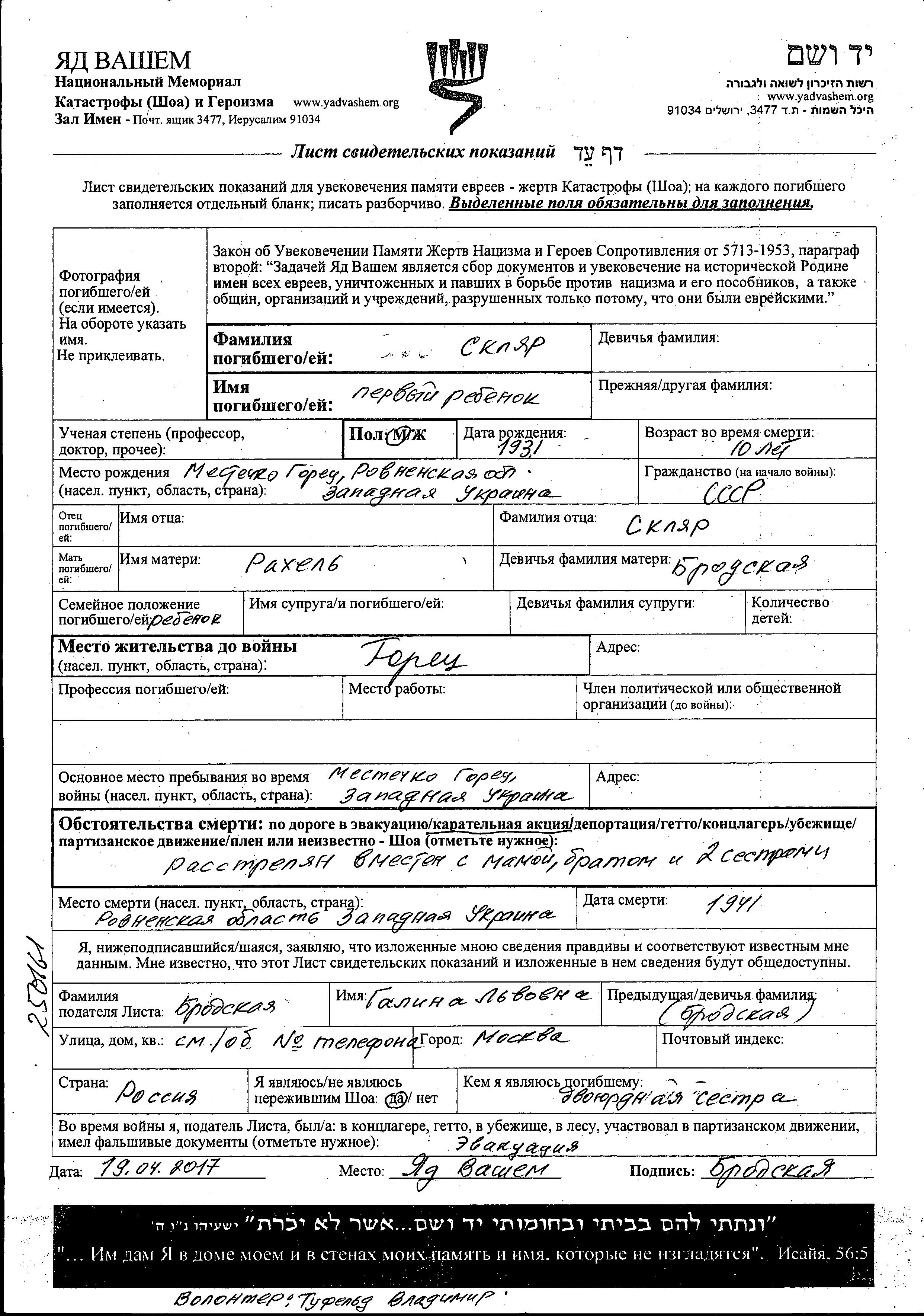 Vorname unbekannt Sklyar wurde im Jahr 1931 in Turzysk, Polen geboren. Er war der Sohn von Rakhel, geb. Brodskaya. Er war Kind. Vor dem Zweiten Weltkrieg lebte er in Turzysk, Polen. Während des Krieges war er in Turzysk, Polen.