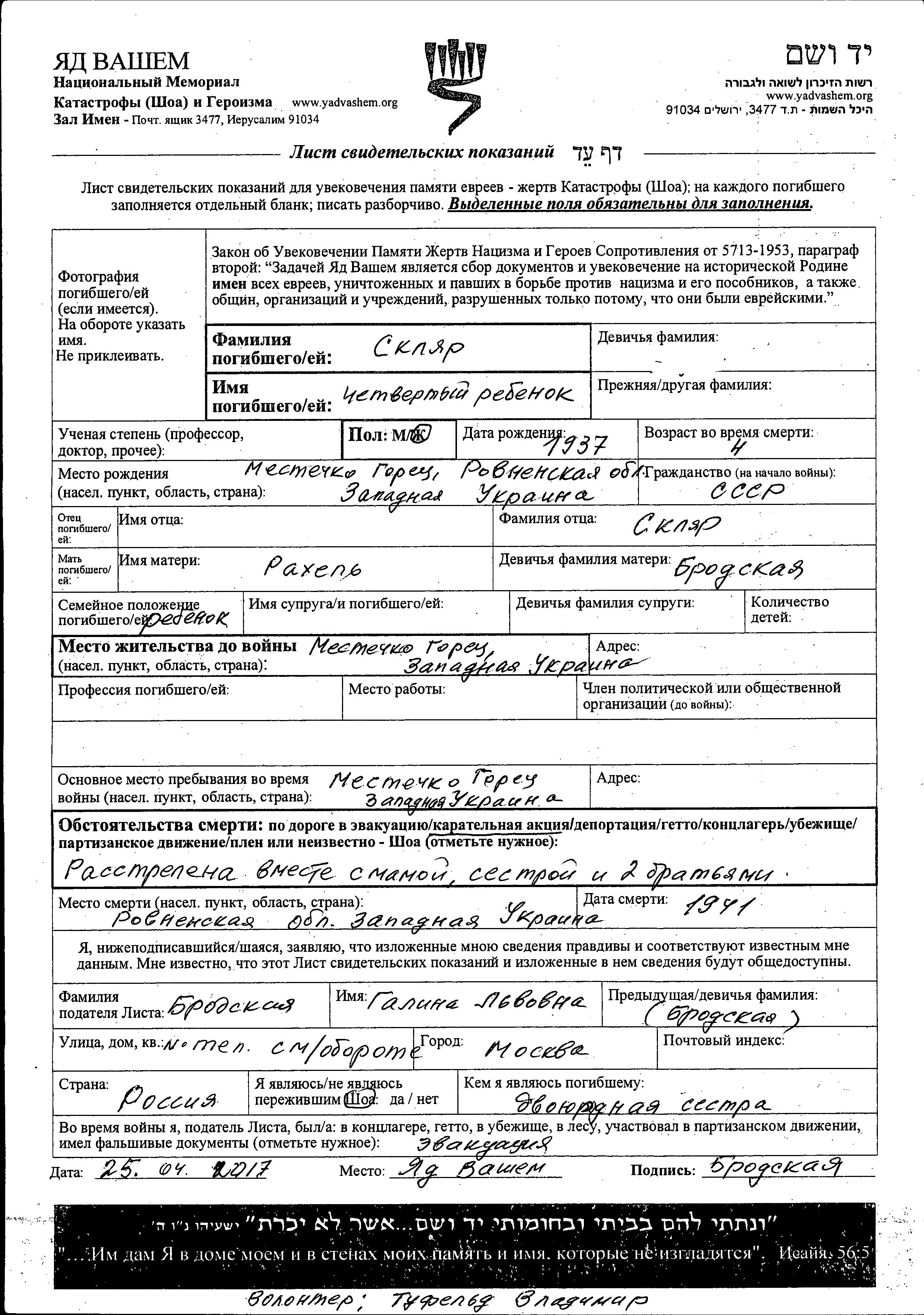 Vorname unbekannt Sklyar wurde im Jahr 1937 in Turzysk, Polen geboren. Sie war die Tochter von Rakhel, geb. Brodskaya. Sie war Kind. Vor dem Zweiten Weltkrieg lebte sie in Turzysk, Polen. Während des Krieges war sie in Turzysk, Polen.