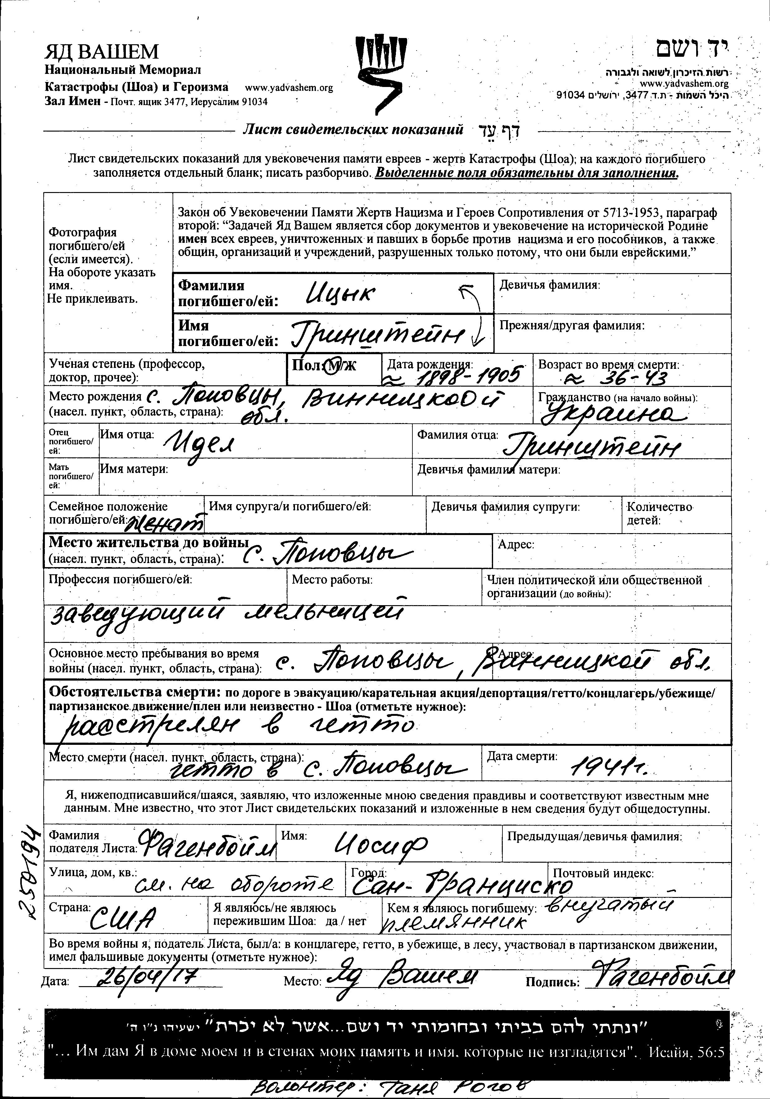 Itzyk Grinshteyn wurde im Jahr 1898 in Popovtsy, Ukraine (UdSSR) geboren. Er war der Sohn von Idel. Er war Zaveduyushchiy melnitzey und Verheiratet. Vor dem Zweiten Weltkrieg lebte er in Popovtsy, Ukraine (UdSSR). Während des Krieges war er in Popovtsy, Ukraine (UdSSR).