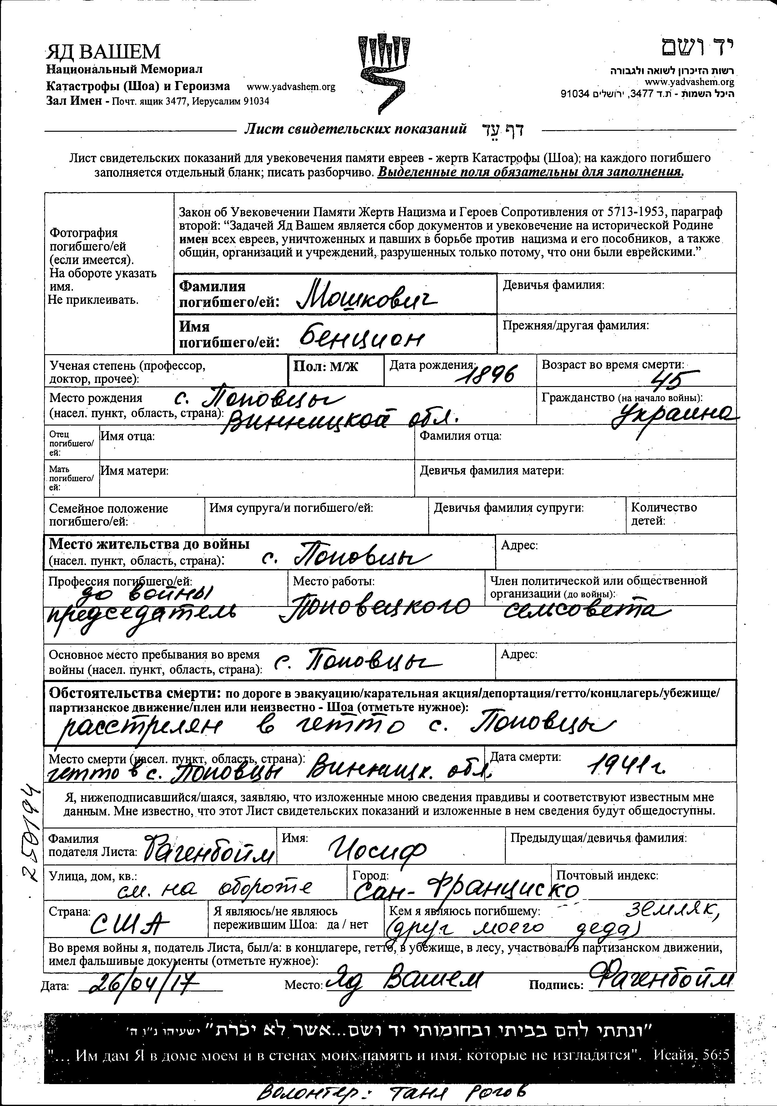 Bentzion Moshkovich wurde im Jahr 1896 in Popovtsy, Ukraine (UdSSR) geboren. Er war Predsedatel selsoveta. Vor dem Zweiten Weltkrieg lebte er in Popovtsy, Ukraine (UdSSR). Während des Krieges war er in Popovtsy, Ukraine (UdSSR).