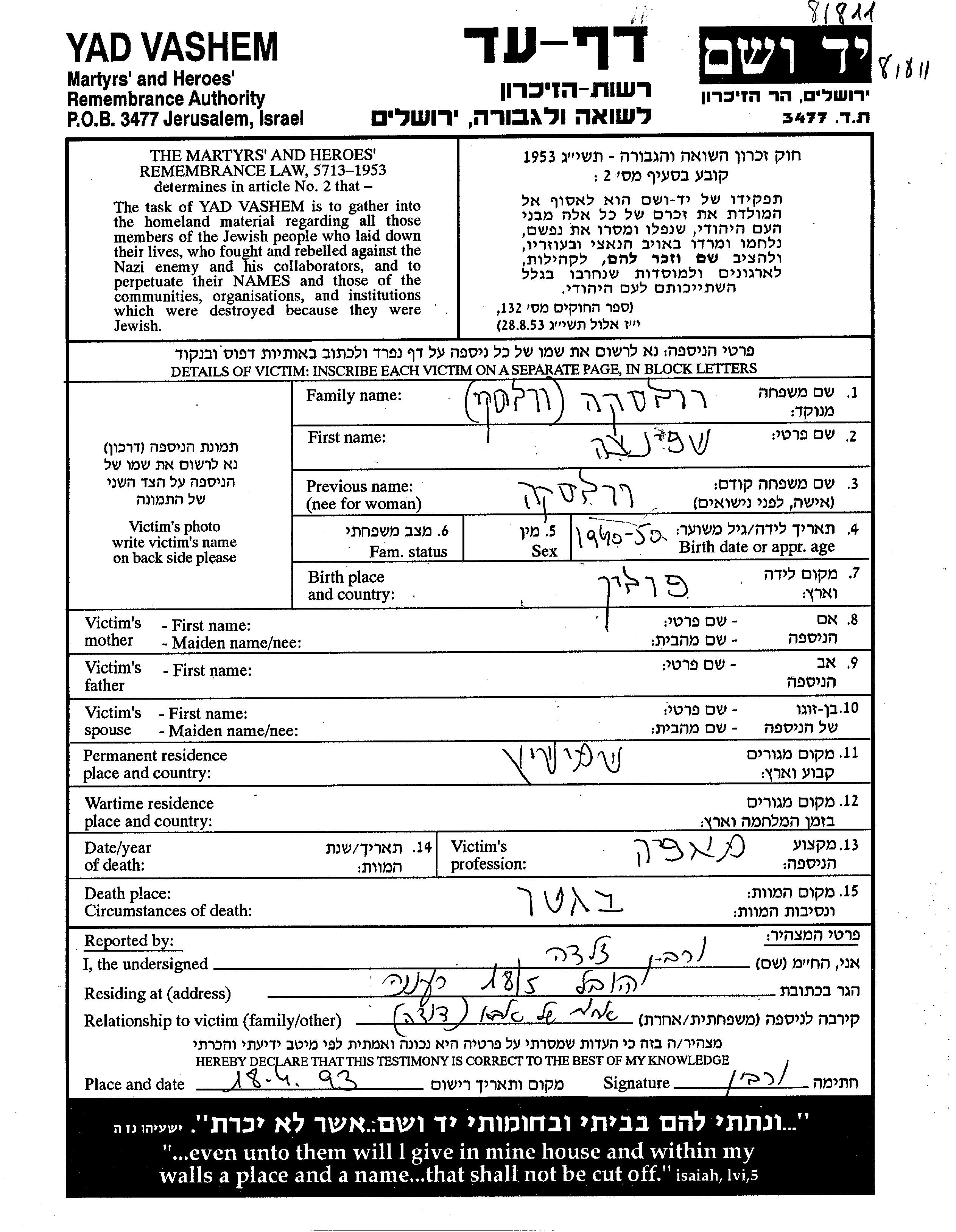 Shprintza wurde in der Schoah ermordet.
