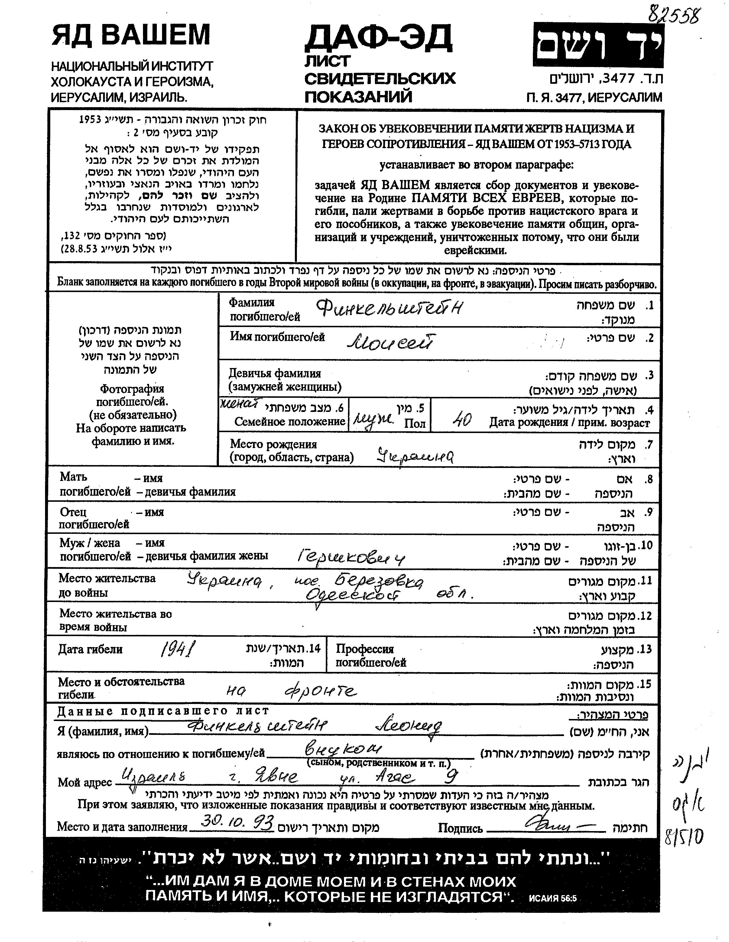 Finkelshtein Moisei 1901 Berezovka, Ukraine (UdSSR) Gedenkblatt