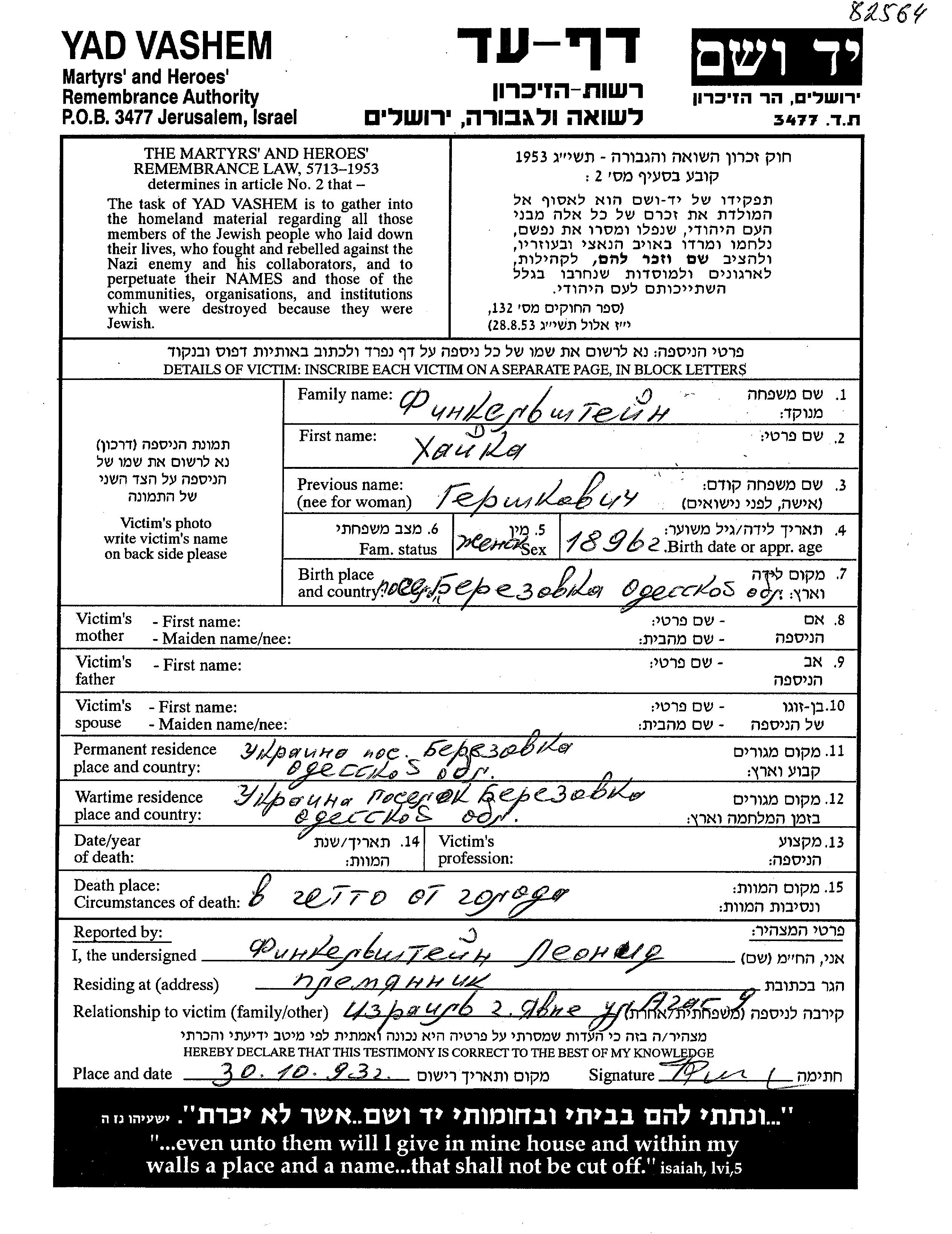 Khaika Finkelshtein, geb. Gershkovich wurde im Jahr 1896 in Berezovka, Ukraine (UdSSR) geboren. Vor dem Zweiten Weltkrieg lebte sie in Berezovka, Ukraine (UdSSR). Während des Krieges war sie in Berezovka, Ukraine (UdSSR).