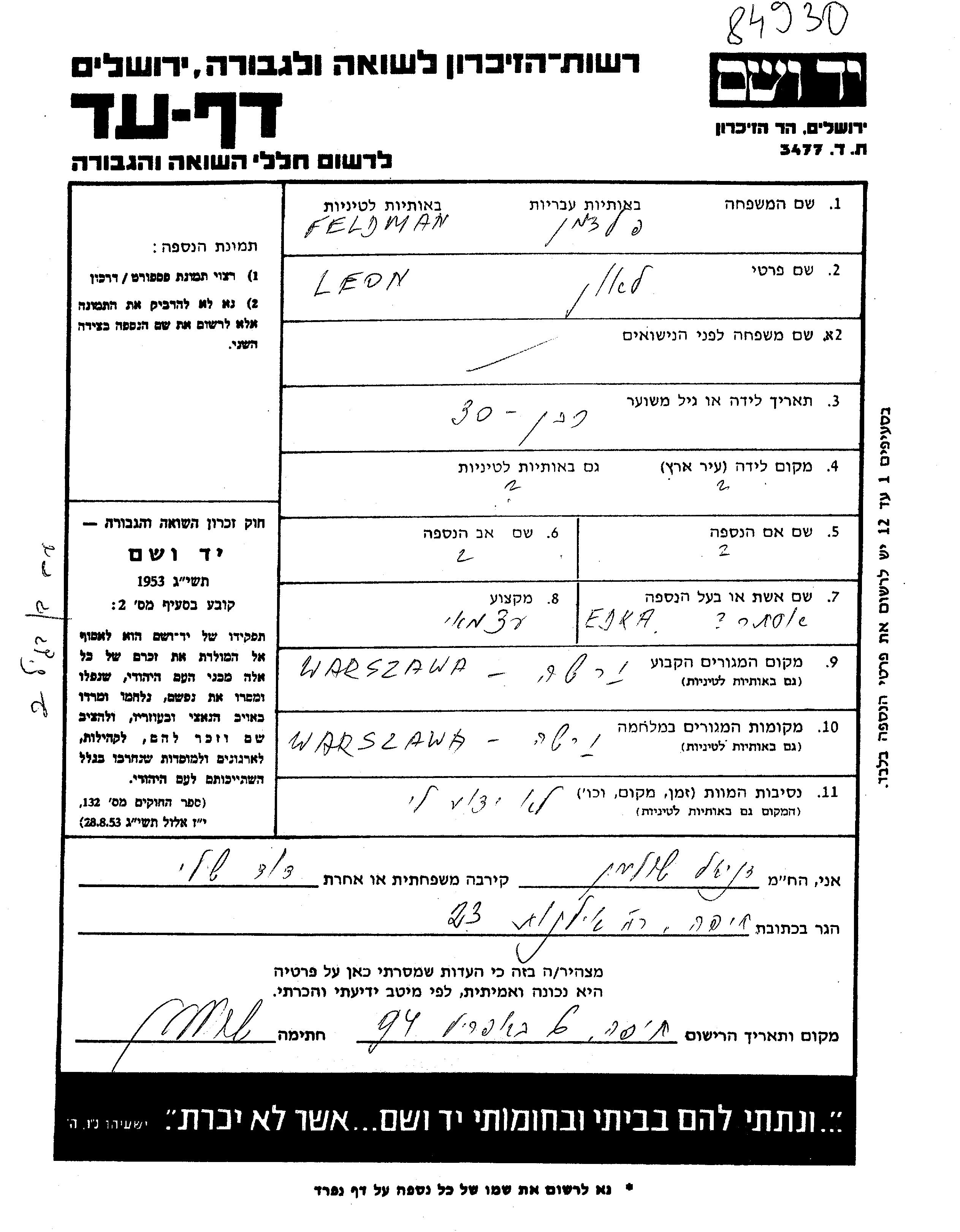 Lion Feldman. Er war mit Edka Ester Verheiratet. Vor dem Zweiten Weltkrieg lebte er in Warszawa, Polen. Während des Krieges war er in Warszawa, Polen.