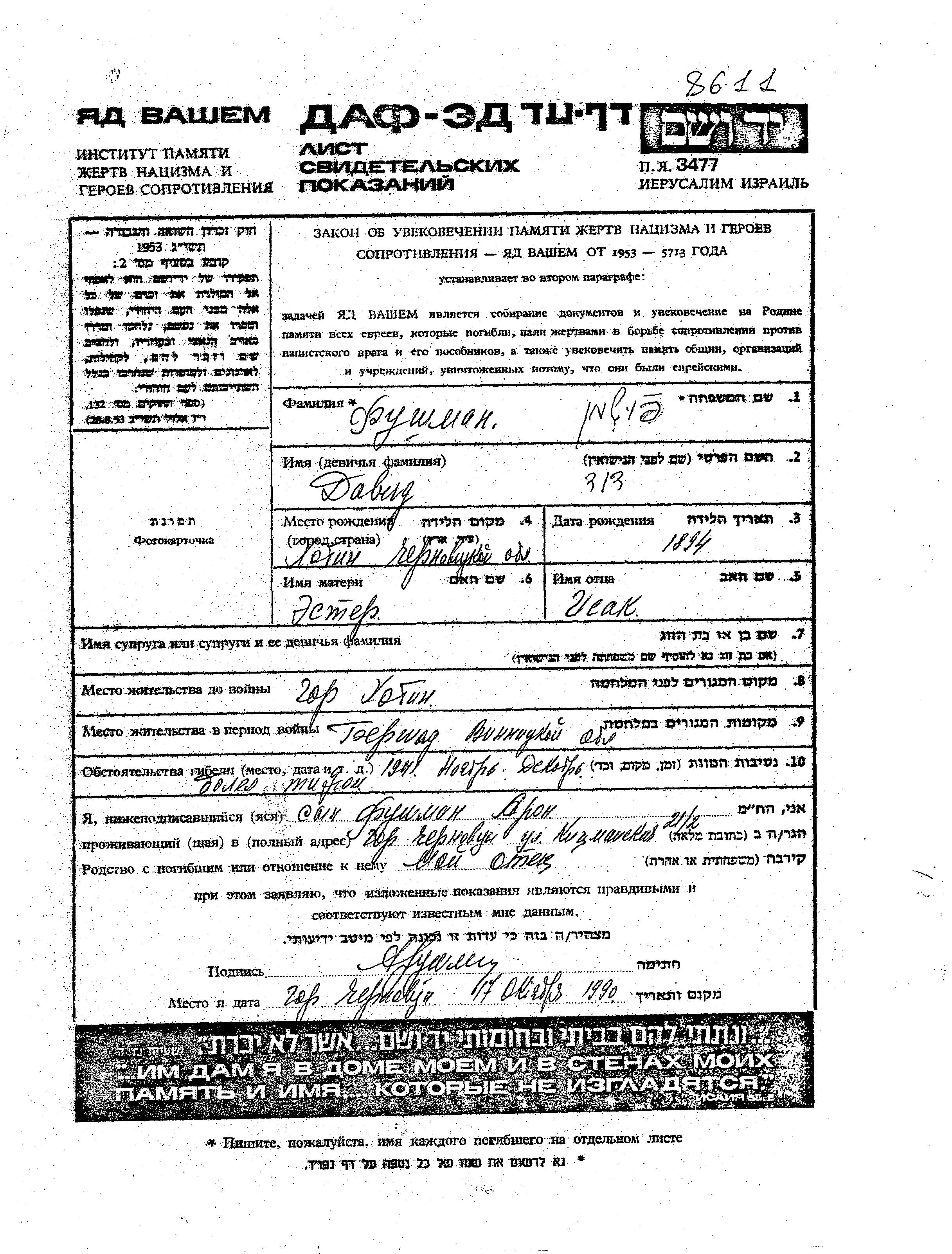 David Fushman wurde im Jahr 1894 in Hotin, Rumänien geboren. Er war der Sohn von Isak und Ester. Vor dem Zweiten Weltkrieg lebte er in Hotin, Rumänien. Während des Krieges war er in Hotin, Rumänien.