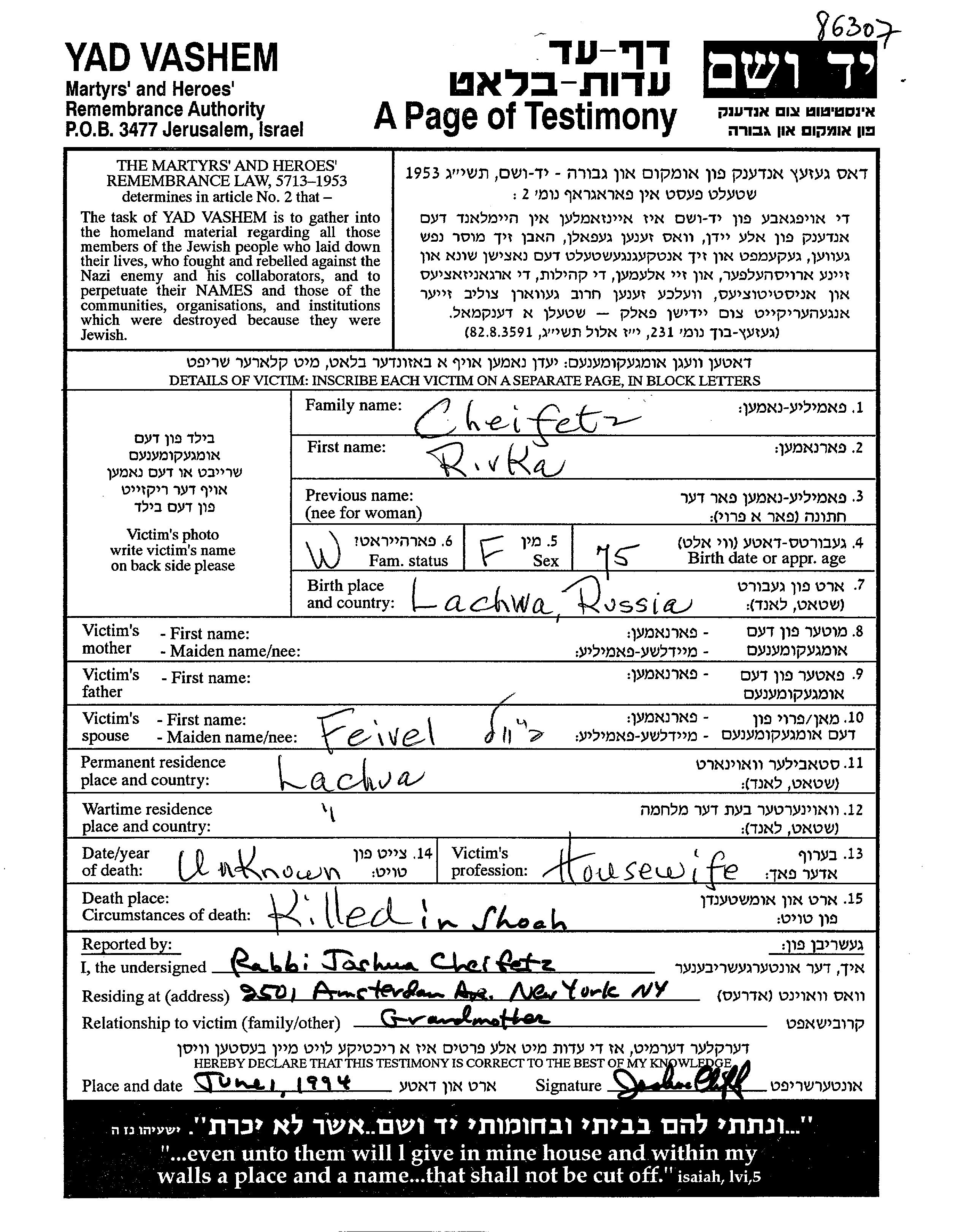 Rivka Cheifetz wurde in Lachwa, Polen geboren. Sie war Hausfrau und mit Faivel Verwitwet. Vor dem Zweiten Weltkrieg lebte sie in Lachwa, Polen. Während des Krieges war sie in Lachwa, Polen.
