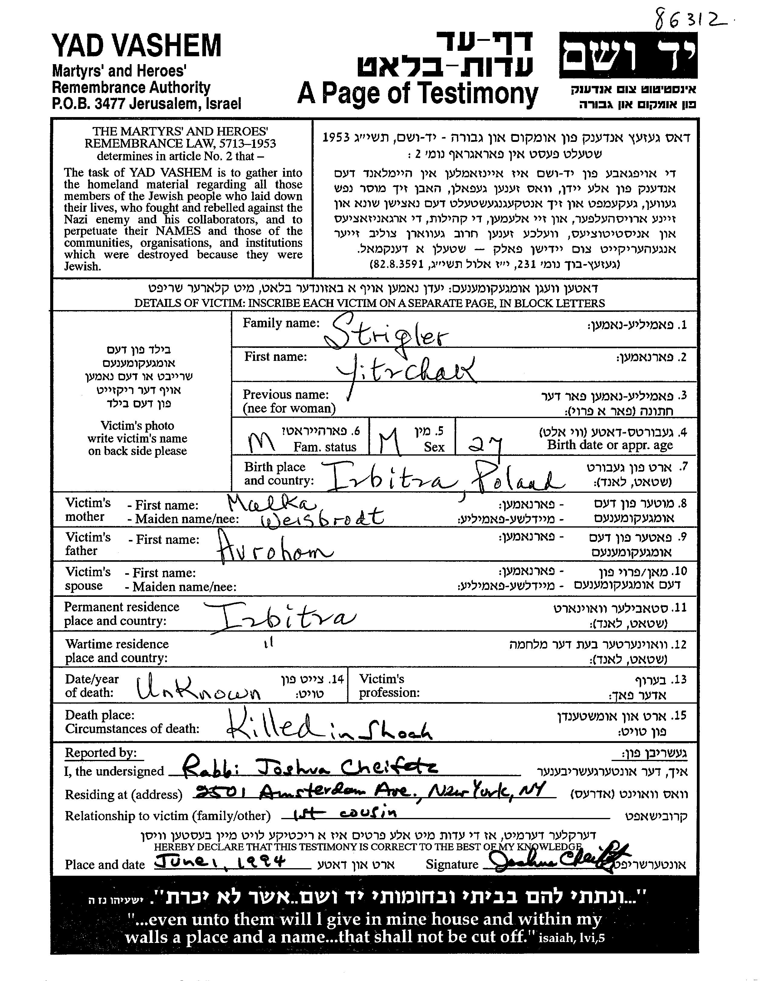 Yitzchak Strigler wurde in Izbica, Polen geboren. Er war der Sohn von Avraham und Malka, geb. Weisbrodt. Er war Verheiratet. Vor dem Zweiten Weltkrieg lebte er in Izbica, Polen. Während des Krieges war er in Izbica, Polen.