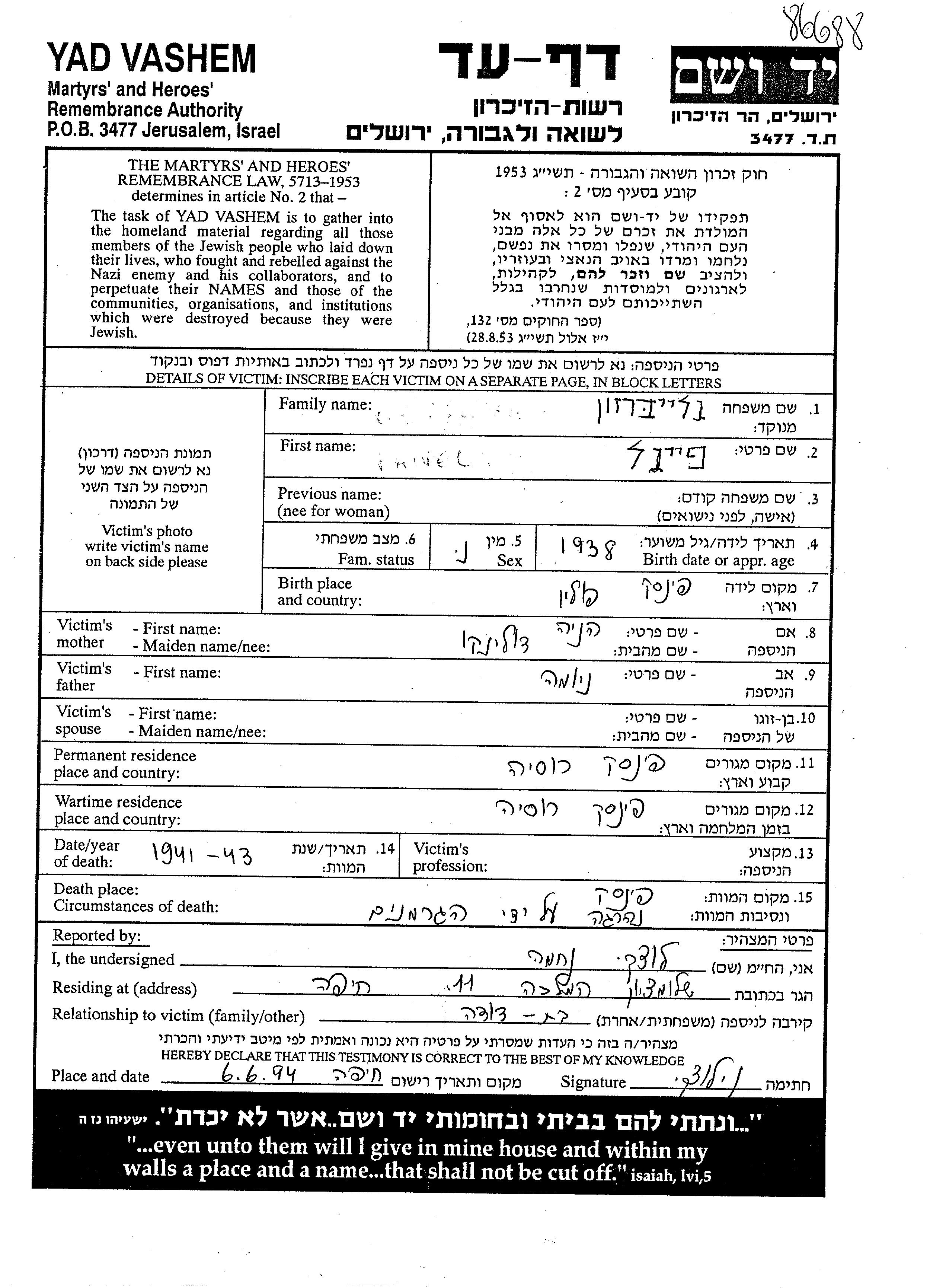 Faivel wurde in der Schoah ermordet. Todesort: Pinsk, Polen.
