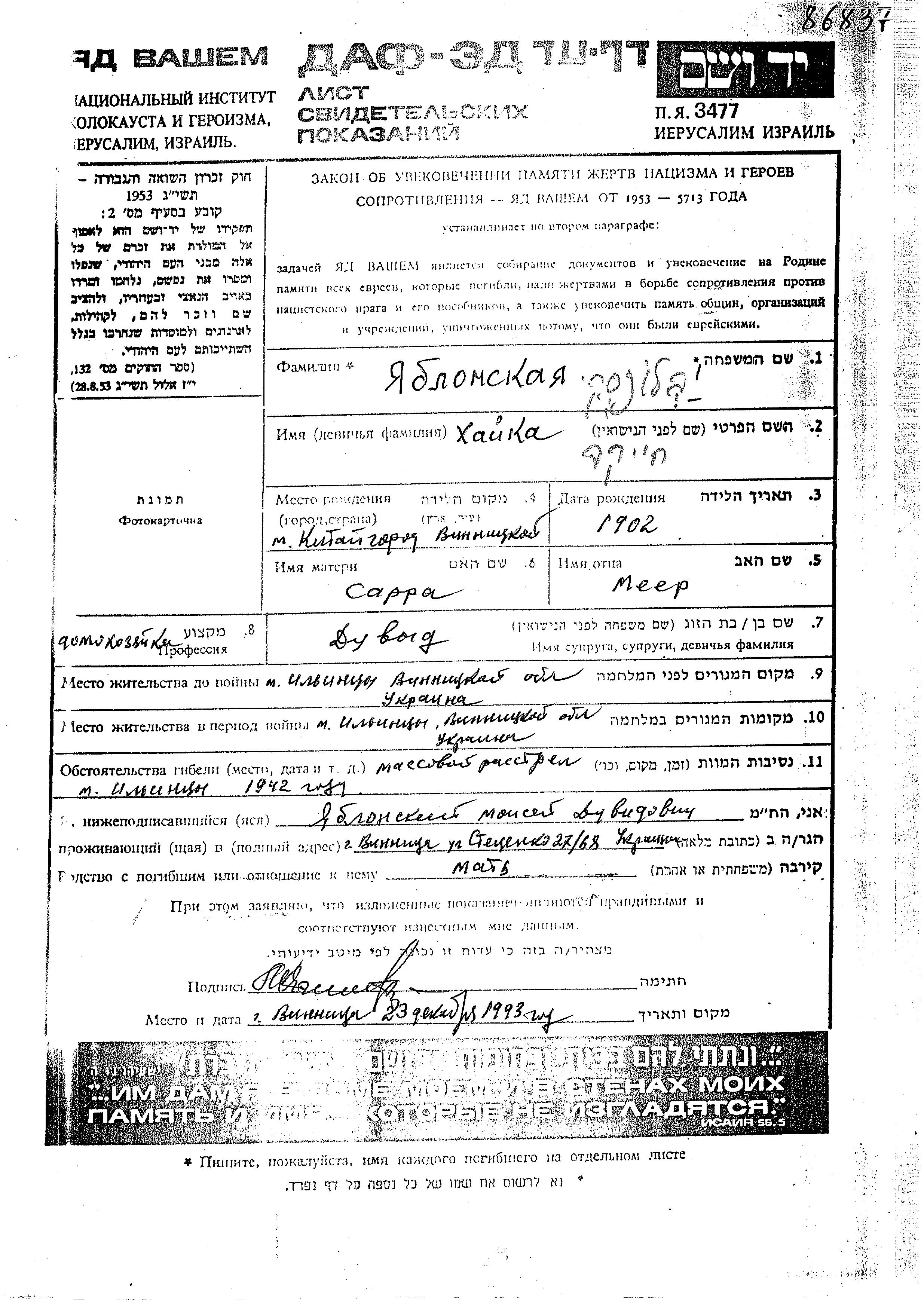 Yablonski Khaika 1902 Ilintsy, Ukraine (UdSSR) Gedenkblatt