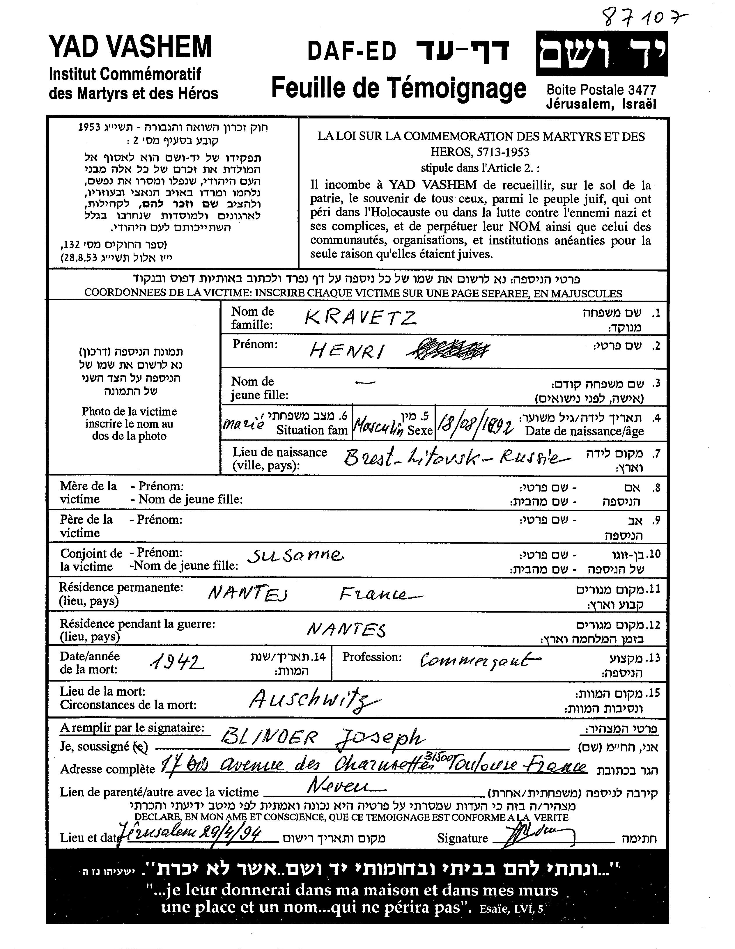 Henri Kravitz wurde im Jahr 1892 in Brest Litowsk, Polen geboren. Er war Kaufmann/-frau und mit Susanne Verheiratet. Vor dem Zweiten Weltkrieg lebte er in Nantes, Frankreich. Während des Krieges war er in Nantes, Frankreich.