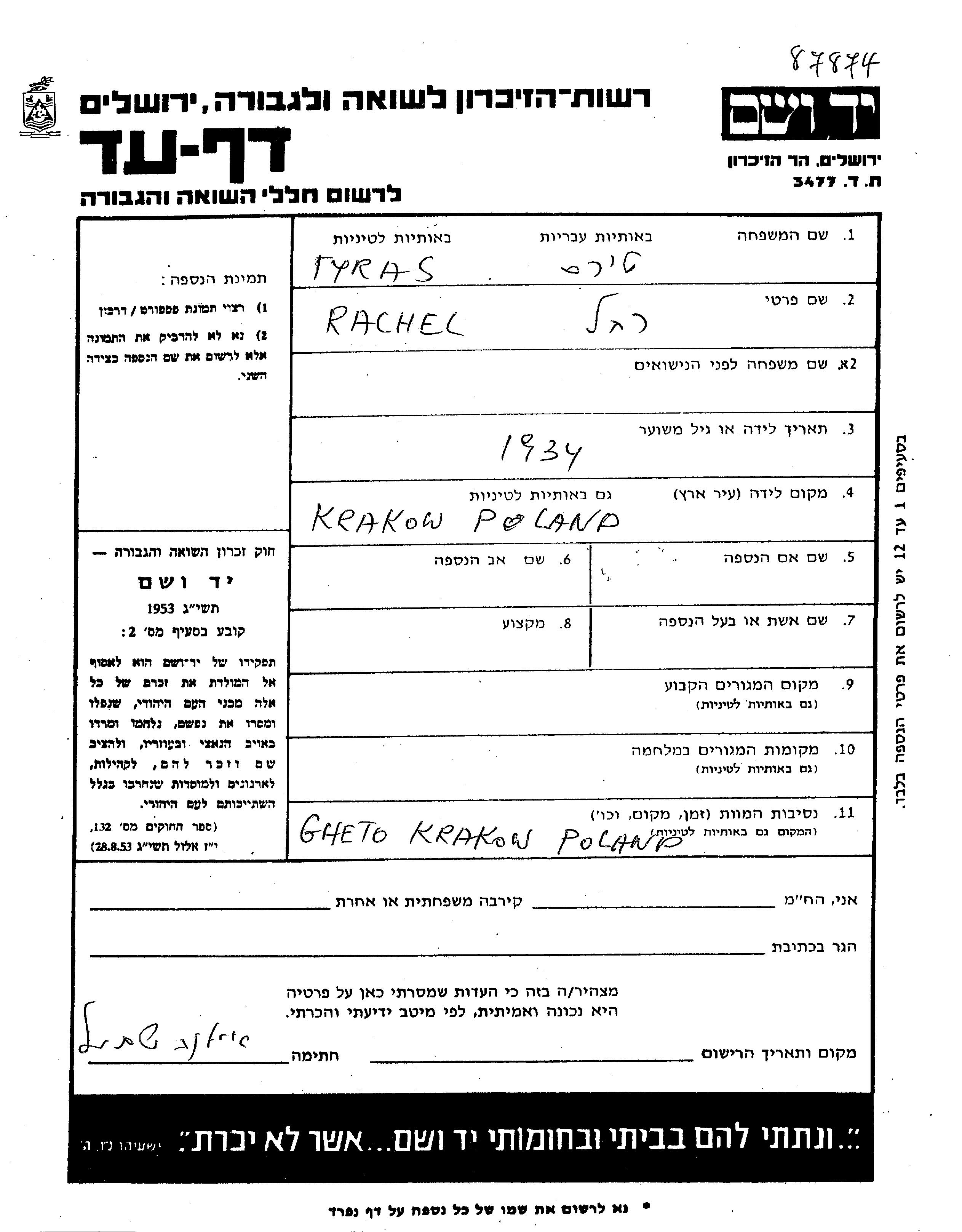 Rachel Tyras wurde im Jahr 1934 in Krakow, Polen geboren. Sie war Kind. Vor dem Zweiten Weltkrieg lebte sie in Krakow, Polen. Während des Krieges war sie in Krakow, Polen.