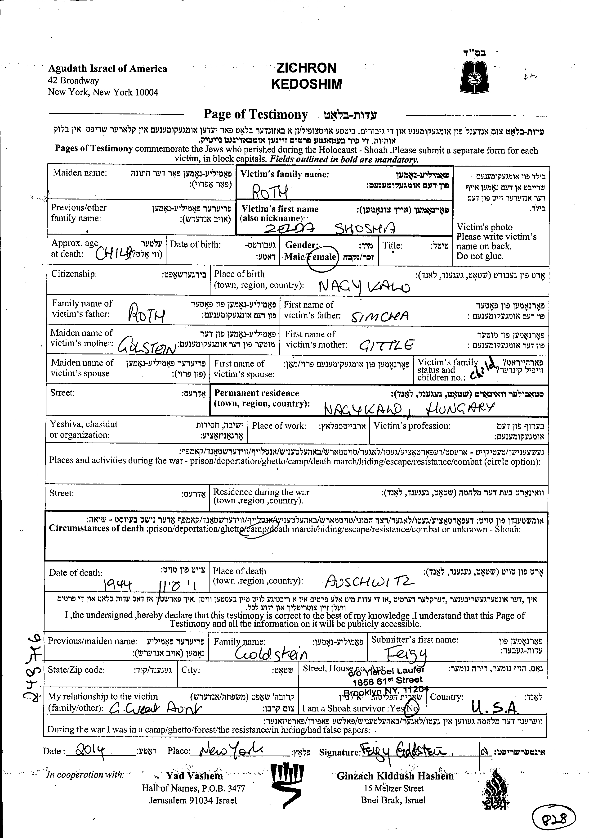 Roth Zelda Shosha Nagykallo, Ungarn Gedenkblatt