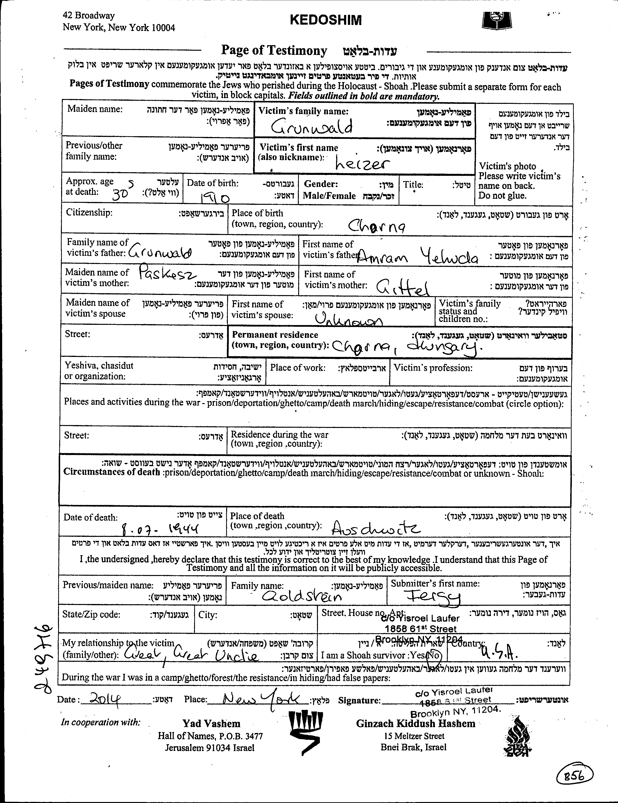 Leizer Grunwald wurde im Jahr 1910 in Chorna, Tschechoslowakei geboren. Er war der Sohn von Amram Yehuda und Gittel, geb. Paskesz. Vor dem Zweiten Weltkrieg lebte er in Chorna, Tschechoslowakei.