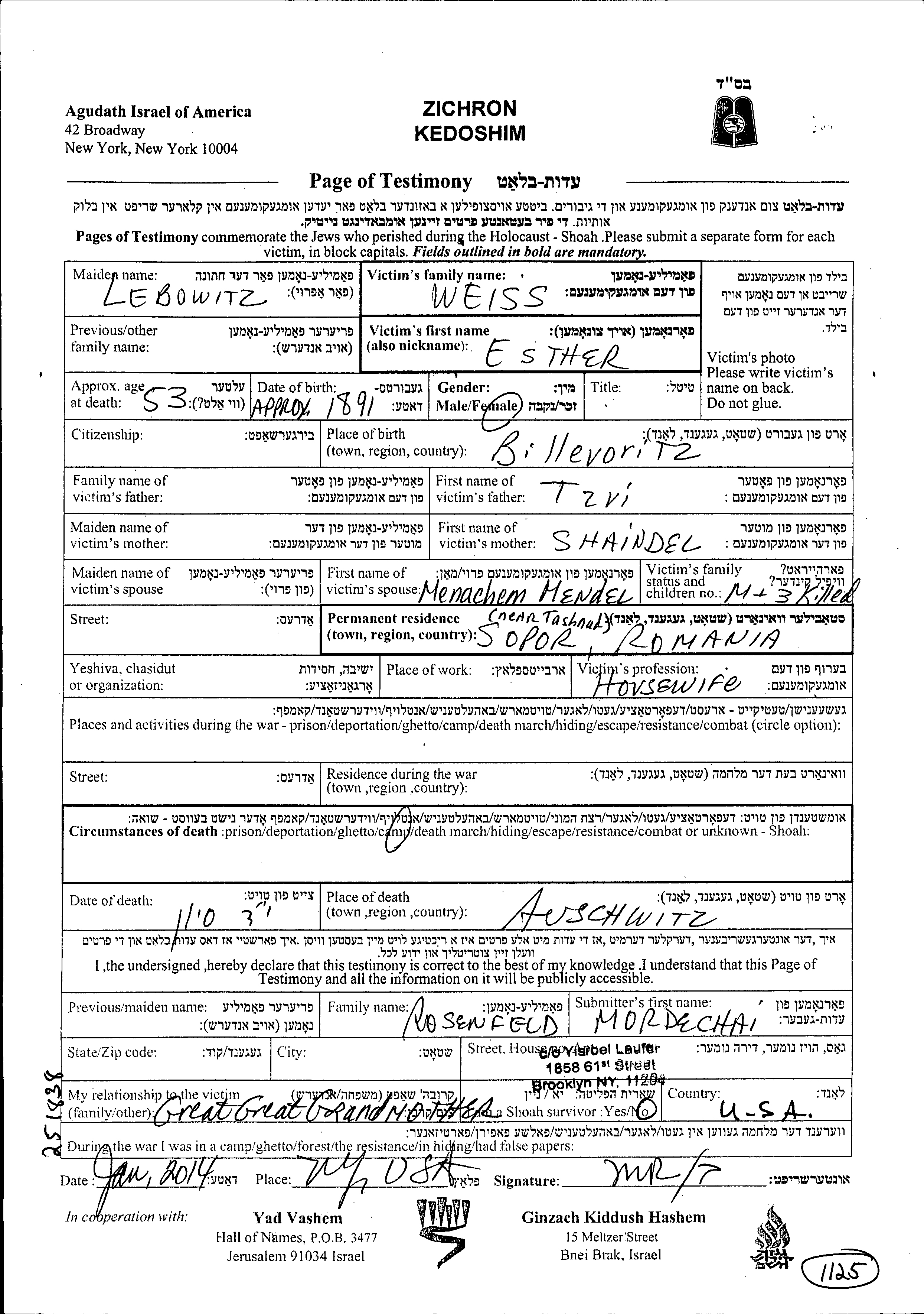 Esther Weiss, geb. Lebowitz wurde im Jahr 1891 in Blidaresti, Rumänien geboren. Sie war die Tochter von Tzvi und Shaindel. Sie war Hausfrau und mit Menachem Mendel Verheiratet. Vor dem Zweiten Weltkrieg lebte sie in Supur, Rumänien.