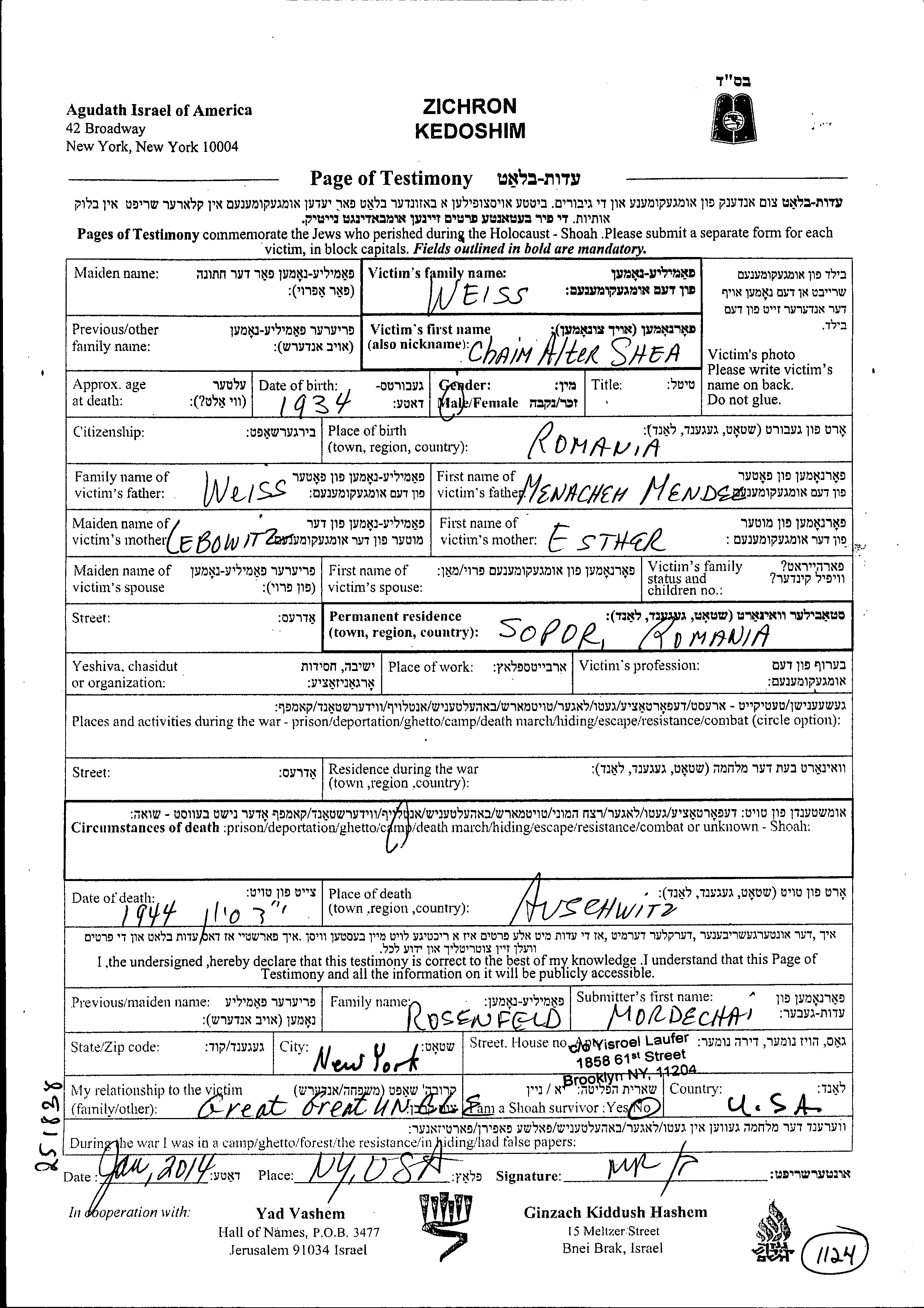 Chaim Alter Shea wurde in der Schoah ermordet. Todesort: Auschwitz, Polen im Jahr 05/06/1944.