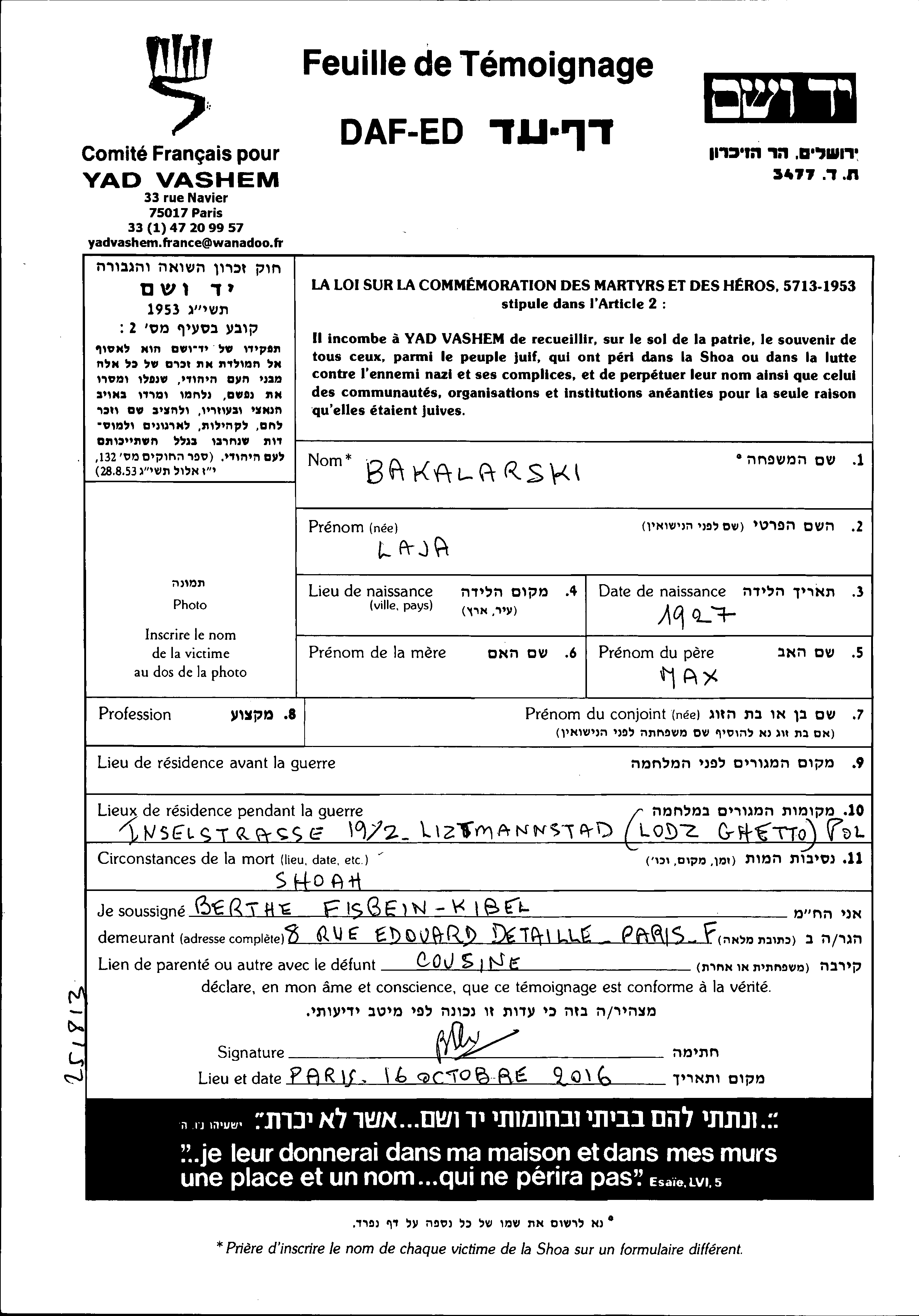Laja Bakalarski wurde im Jahr 1927 geboren. Sie war die Tochter von Max. Während des Krieges war sie in Lodz, Polen.