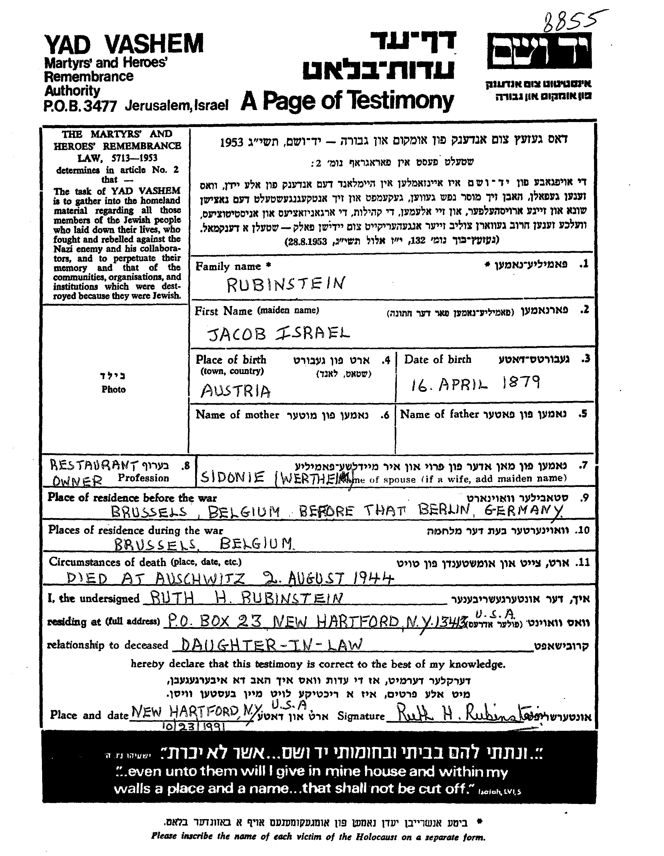 Jacob Israel Rubinstein wurde im Jahr 1879 in Österreich geboren. Er war Restaurantbesitzer/-in und mit Sidonie Verheiratet. Vor dem Zweiten Weltkrieg lebte er in Bruxelles, Belgien. Während des Krieges war er in Bruxelles, Belgien.
