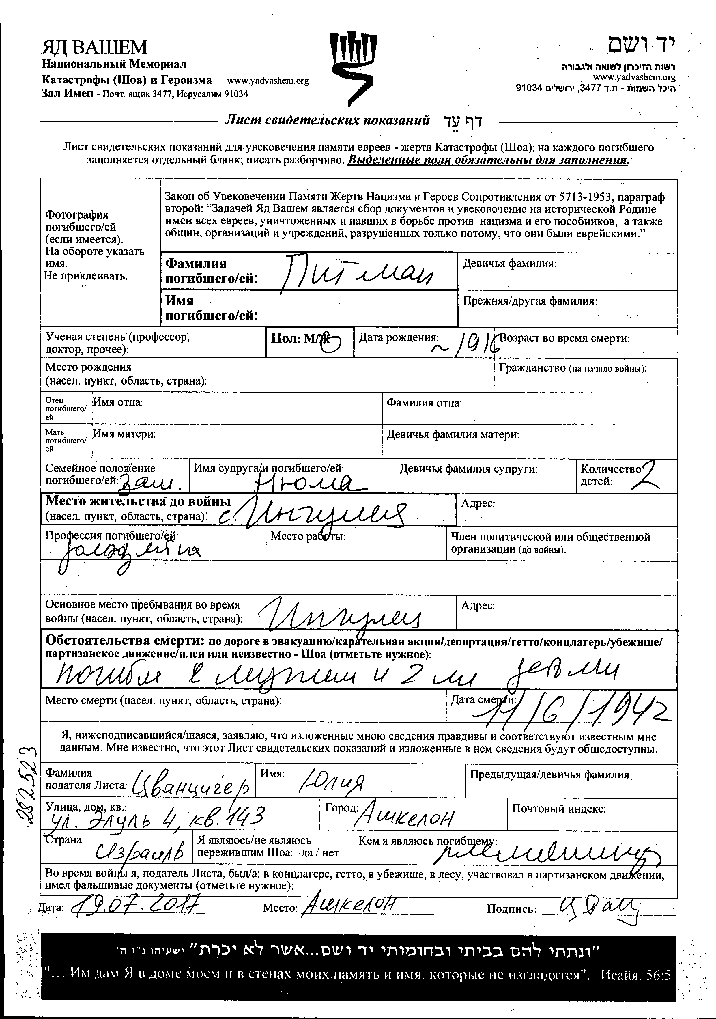 Suche nach einem Todesjahr im Zeitraum der Holocaust: 1933 bis 1945. Bitte wählen Sie 'Exakt' im Auswahlmenü, um nur nach einem einzelnen Jahr zu suchen, alternativ können Sie die flexibleren Optionen '+/- 2 Jahre' oder '+/- 5 Jahre' wählen.