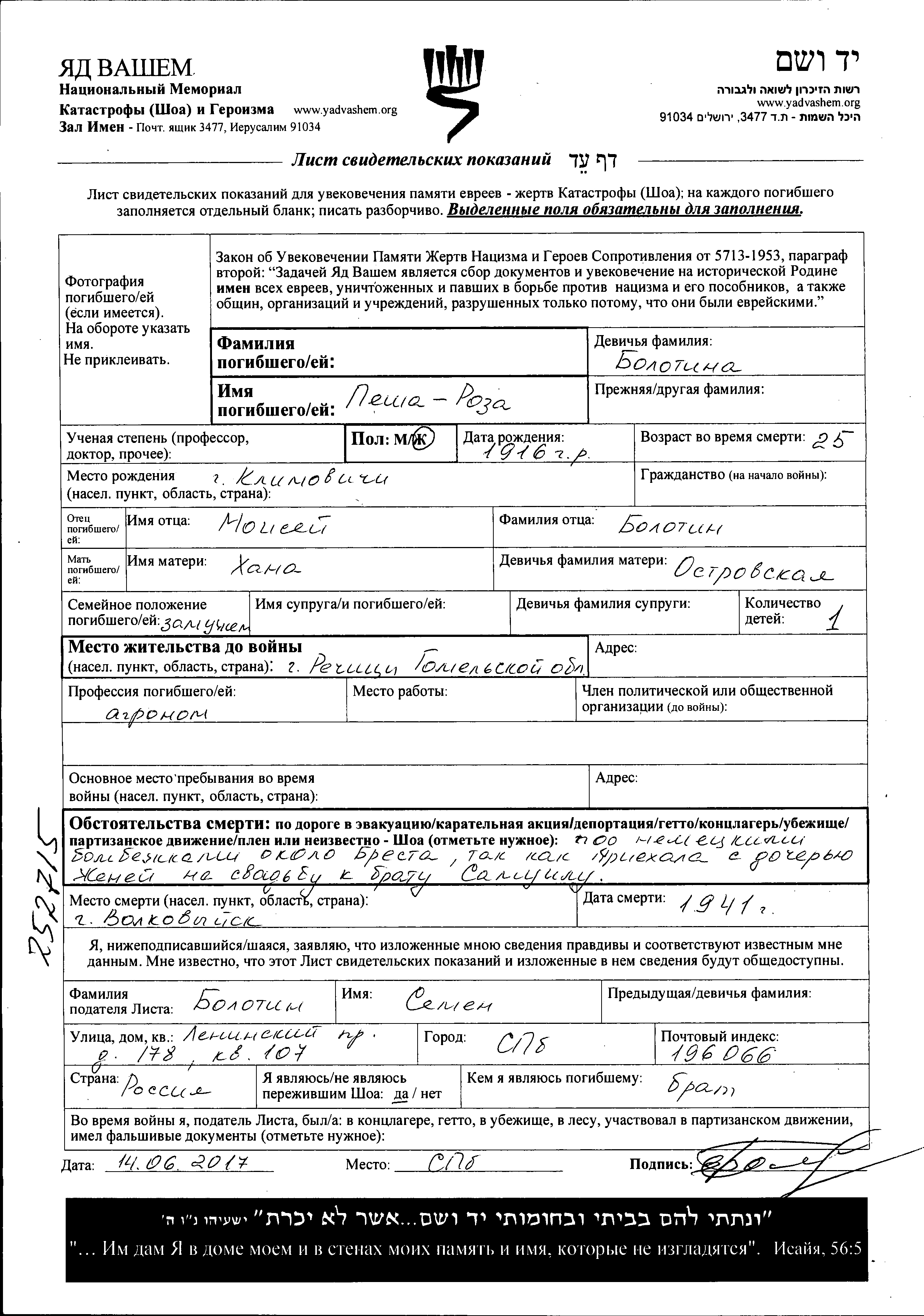 Pesha Roza Name unbekannt, geb. Bolotina wurde in Klimovichi, Weißrussland (UdSSR) geboren. Sie war die Tochter von Moisey und Khana, geb. Ostrovskaya. Sie war Studierter landwirt und Verheiratet. Vor dem Zweiten Weltkrieg lebte sie in Rechitsa, Weißrussland (UdSSR). Während des Krieges war sie in Brest, Polen.