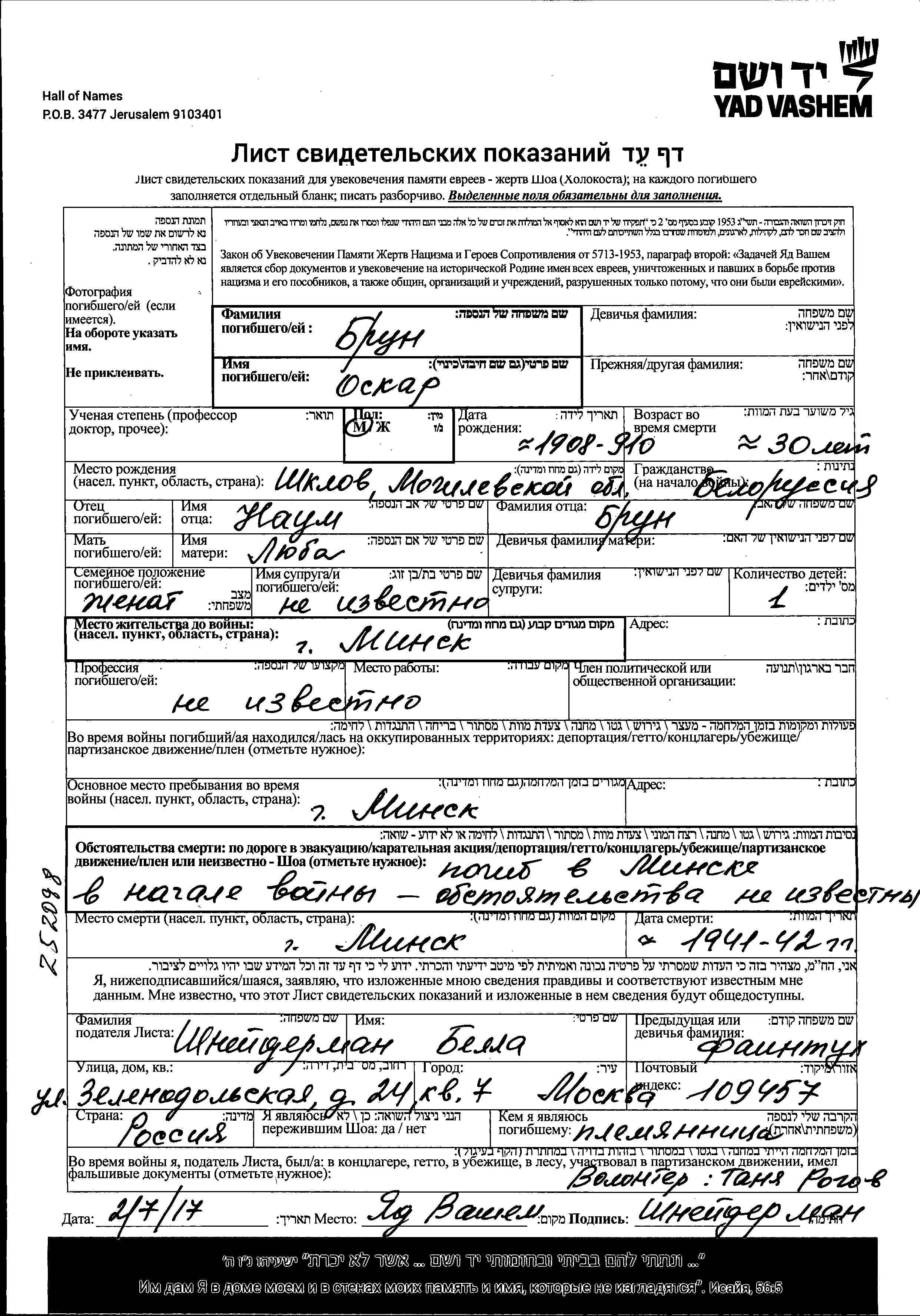 Oskar Brun wurde im Jahr 1910 in Shklov, Weißrussland (UdSSR) geboren. Er war der Sohn von Naum und Lyuba. Er war Verheiratet. Vor dem Zweiten Weltkrieg lebte er in Minsk, Weißrussland (UdSSR). Während des Krieges war er in Minsk, Weißrussland (UdSSR).