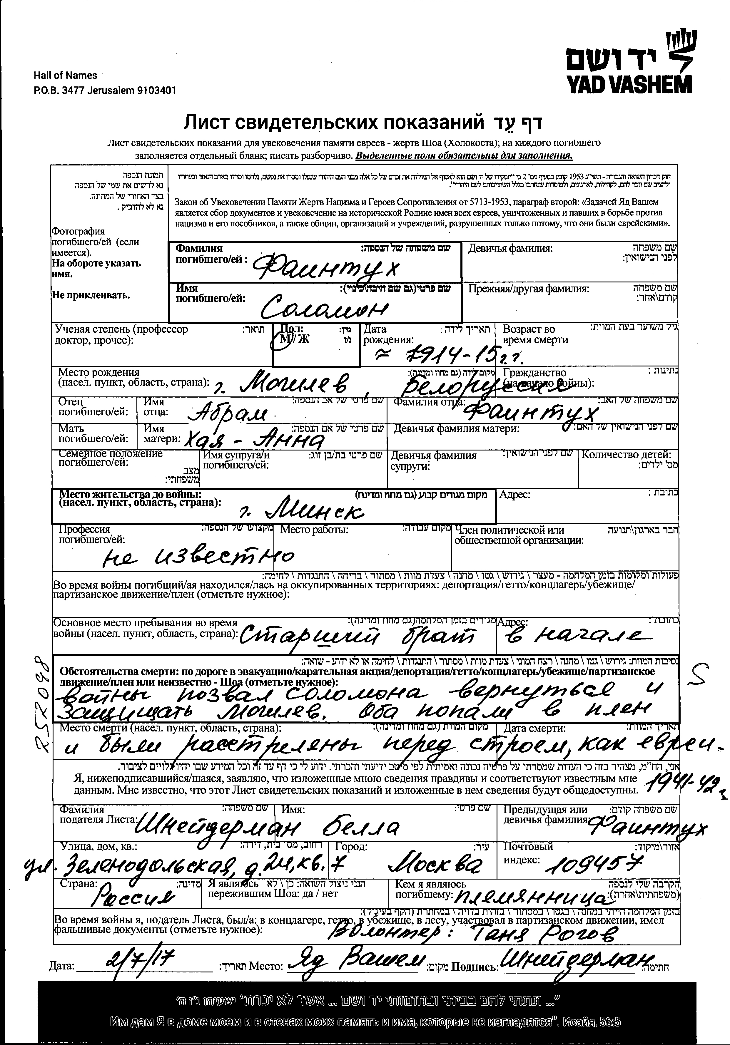 Solomon wurde in der Schoah ermordet. Todesort: Mogilev, Weißrussland (UdSSR) im Jahr 1941.