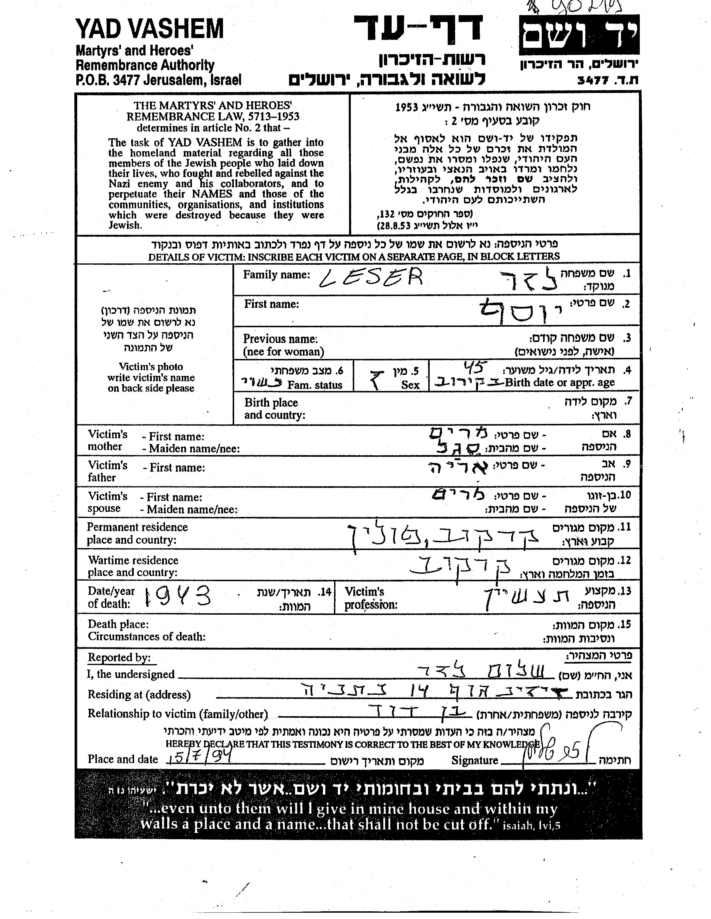 Josef Leser Lazar wurde Er war der Sohn von Arie und Miriam, geb. Segal. Er war Industrielle/-r und mit Miriam Verheiratet. Vor dem Zweiten Weltkrieg lebte er in Krakow, Polen. Während des Krieges war er in Krakow, Polen.