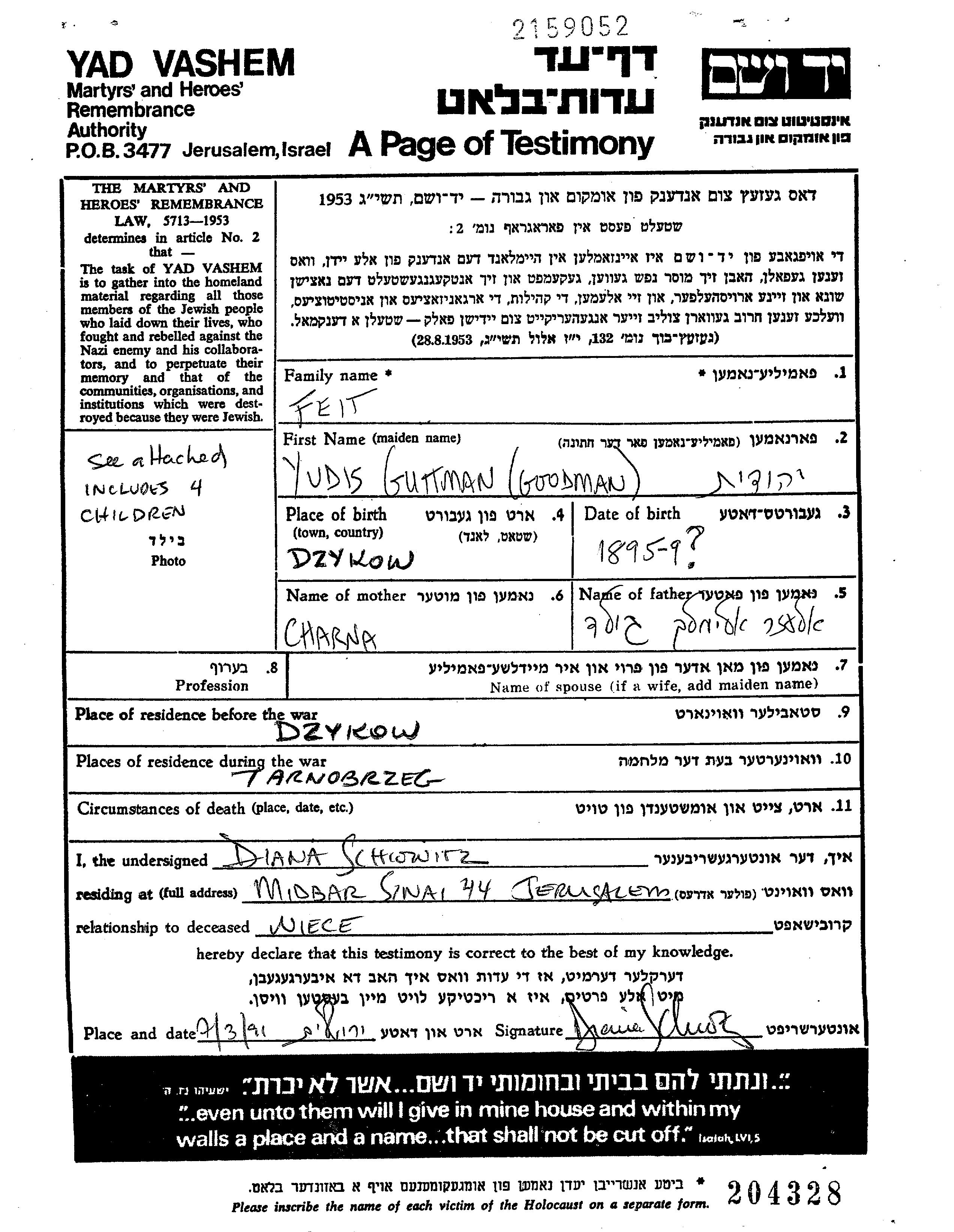 Hadas Yehudit Feit, geb. Guttman wurde in Dzikow, Polen geboren. Vor dem Zweiten Weltkrieg lebte sie in Dzikow, Polen.