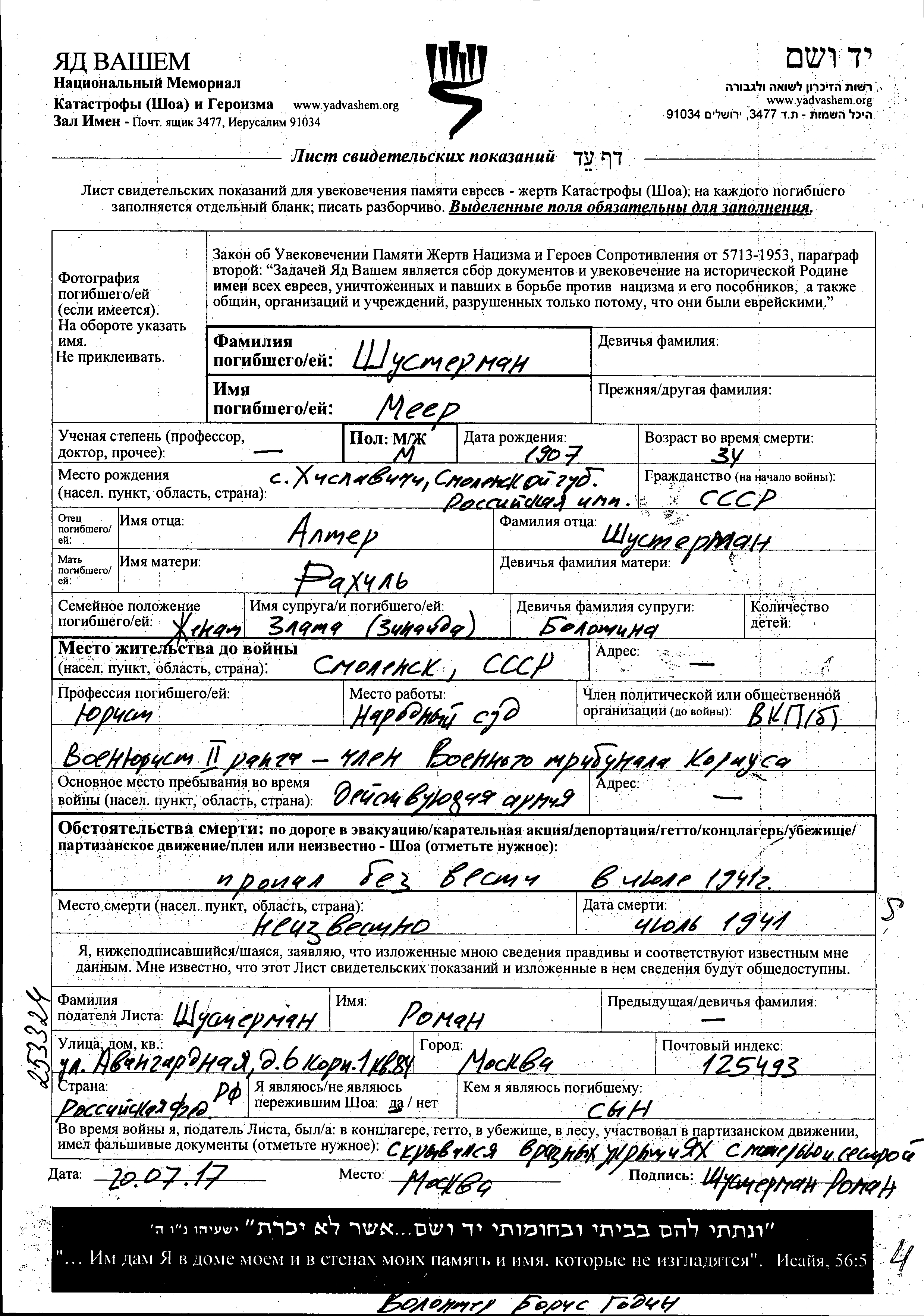 Meyer Shusterman wurde im Jahr 1907 in Khislavichi, Russland (UdSSR) geboren. Er war der Sohn von Alter und Rakhil. Er war Jurist und mit Zlata Zinaida, geb. Bolotina Verheiratet. Vor dem Zweiten Weltkrieg lebte er in Smolensk, Russland (UdSSR). Während des Krieges war er in die Sowjetischen Streitkräfte.