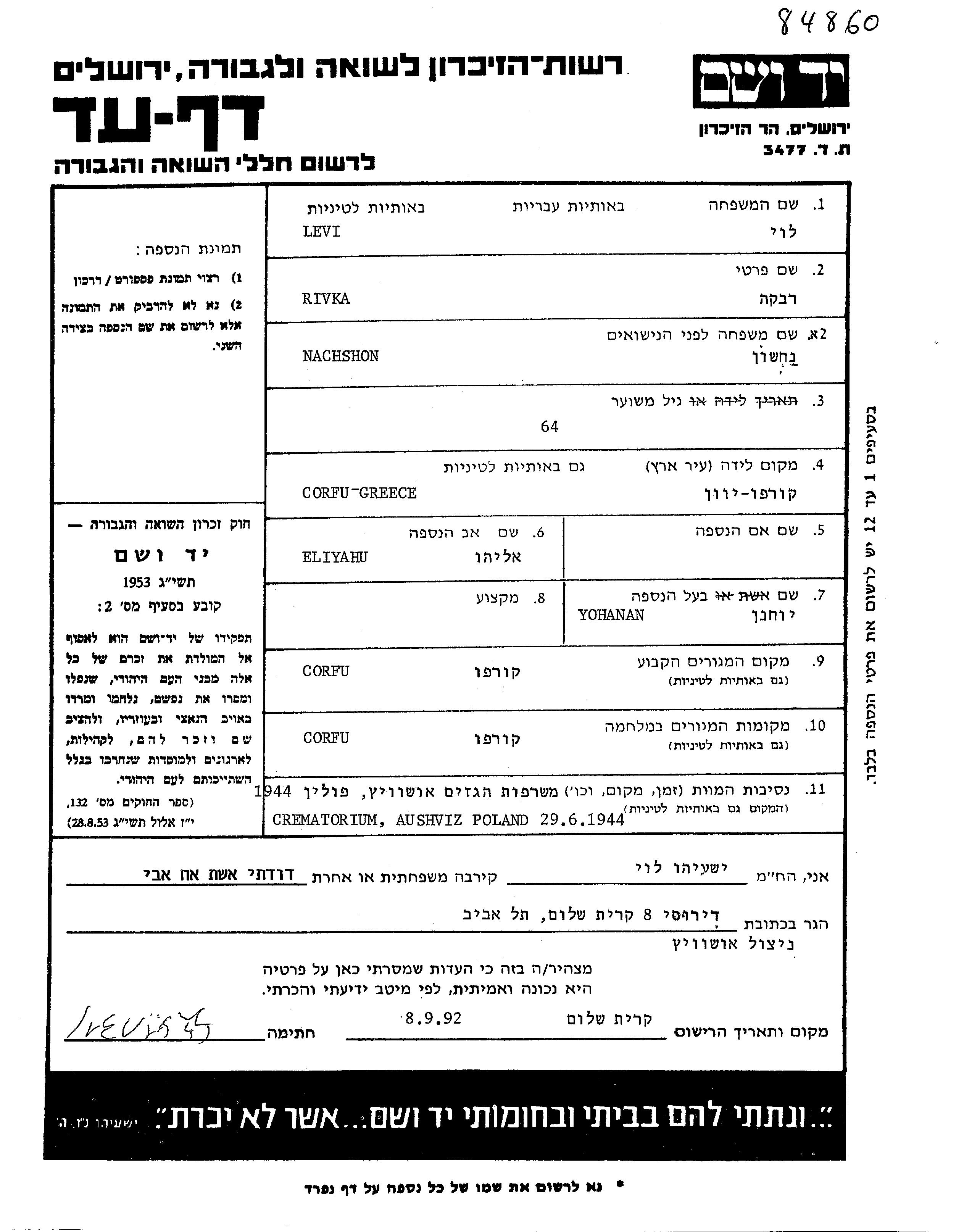 Rivka Levi, geb. Nachshon wurde in Corfu, Griechenland geboren. Vor dem Zweiten Weltkrieg lebte sie in Corfu, Griechenland.