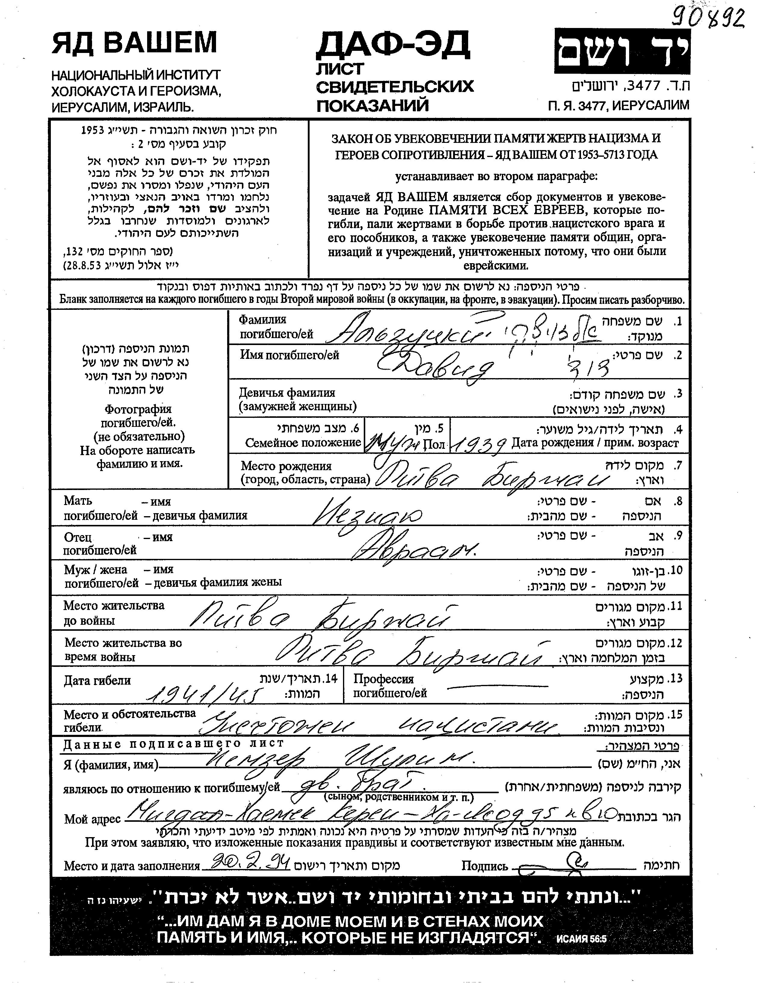 Alzutzki David 1939 Birzai, Litauen Gedenkblatt