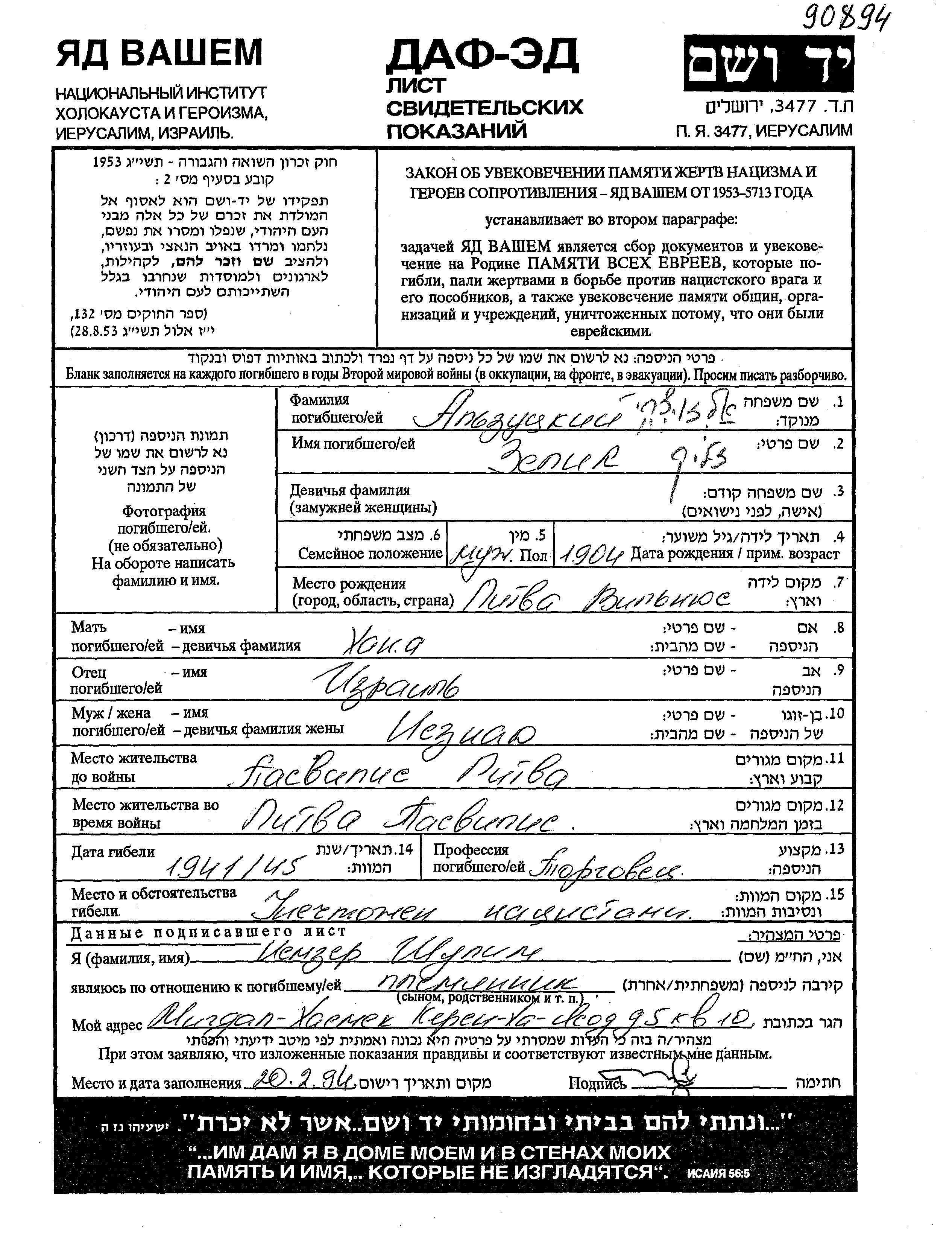 Zelig Alzutzki wurde im Jahr 1904 in Vilnius, Polen geboren. Er war der Sohn von Izrail und Khana. Er war Verkäufer/-in. Vor dem Zweiten Weltkrieg lebte er in Pasvalys, Litauen. Während des Krieges war er in Pasvalys, Litauen.