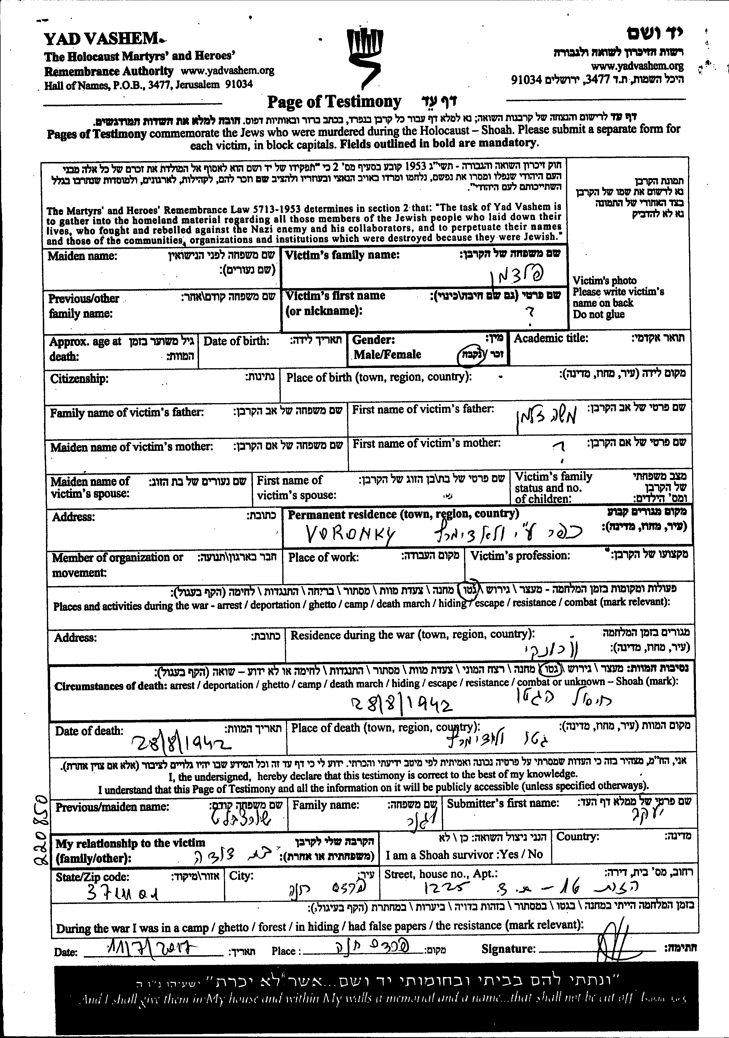 Aufenthaltsort während des Krieges/Schoah