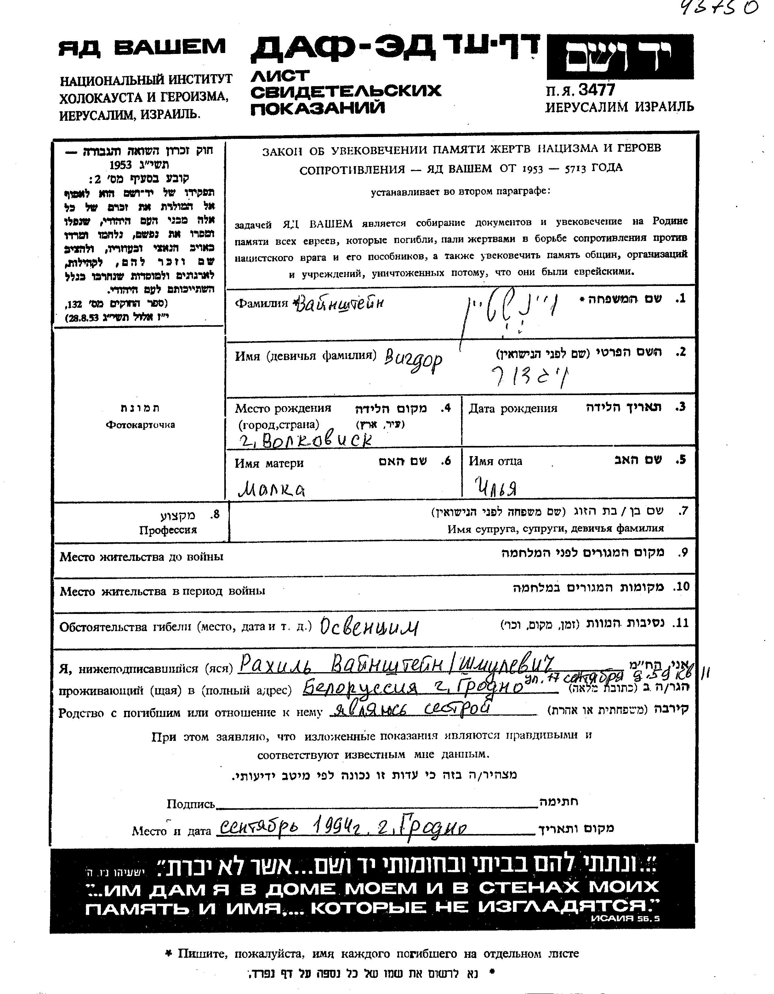 Vigdor wurde in der Schoah ermordet. Todesort: Auschwitz, Polen.