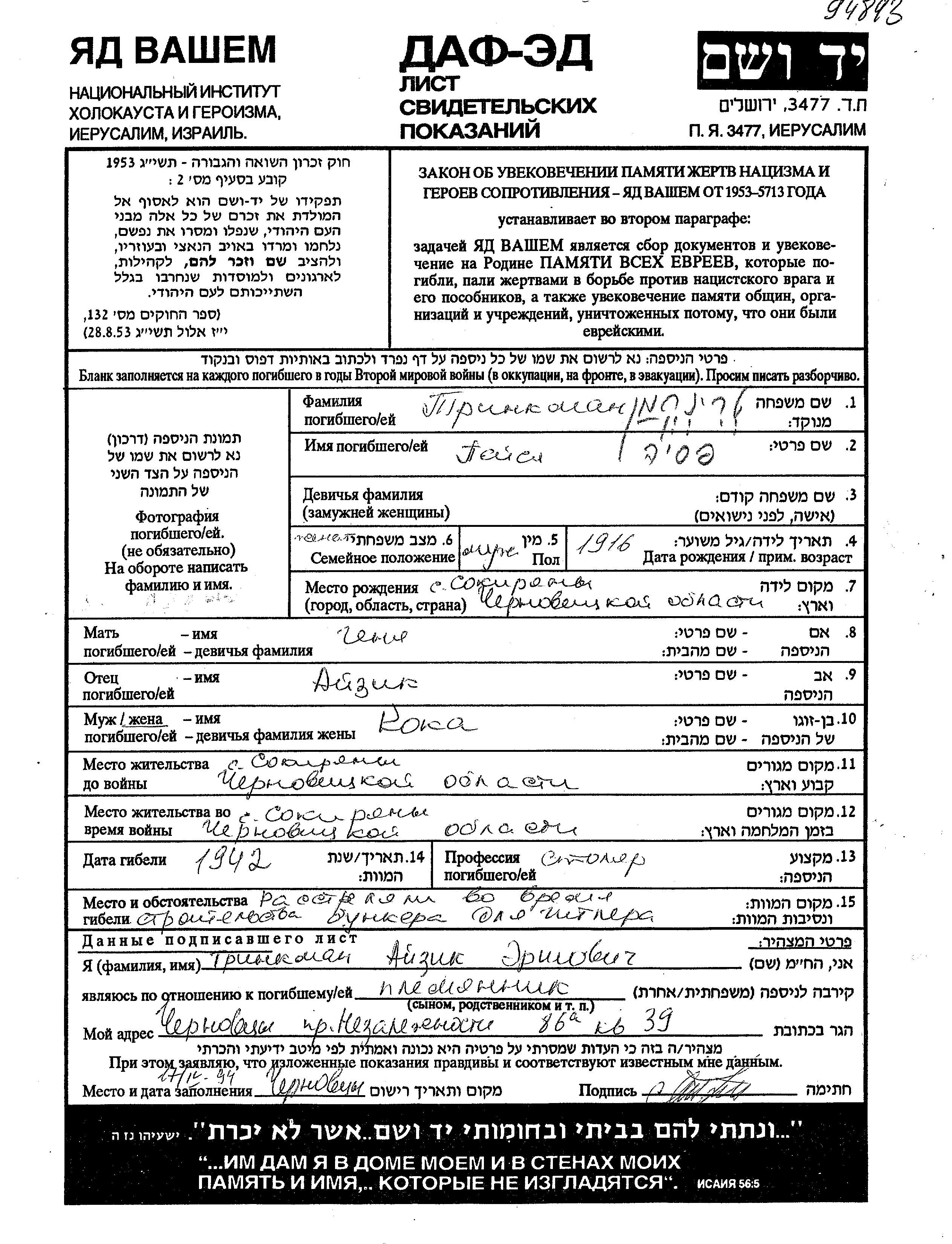 Pesia Trinkman wurde im Jahr 1916 in Secureni, Rumänien geboren. Sie war die Tochter von Aizik und Genia. Sie war Zimmermann und mit Koka Verheiratet. Vor dem Zweiten Weltkrieg lebte sie in Secureni, Rumänien. Während des Krieges war sie in Secureni, Rumänien.