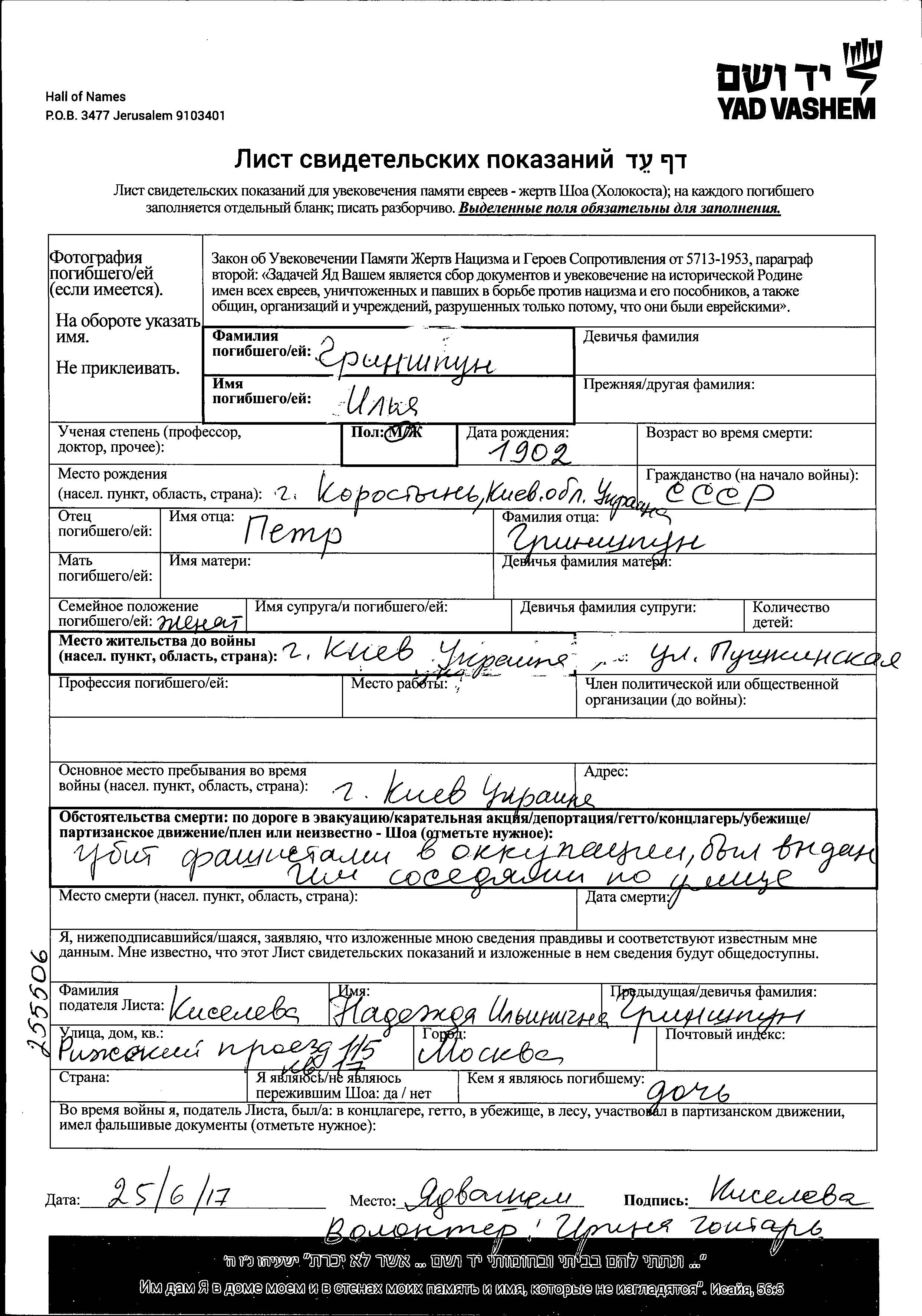 Ilya Grinshpun wurde im Jahr 1902 in Korosten, Ukraine (UdSSR) geboren. Er war der Sohn von Pyotr. Er war Verheiratet. Vor dem Zweiten Weltkrieg lebte er in Kiev, Ukraine (UdSSR). Während des Krieges war er in Kiev, Ukraine (UdSSR).