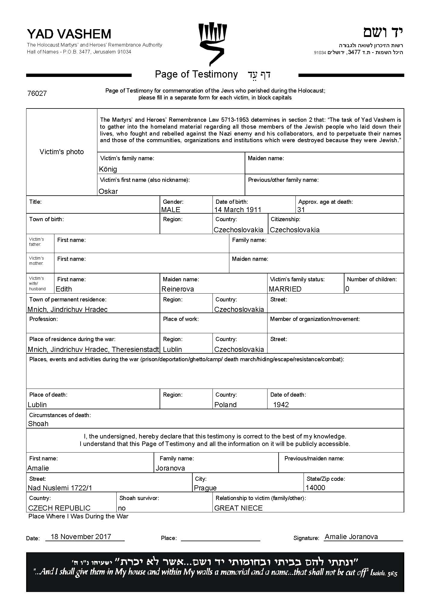 Oskar König wurde im Jahr 1911 in Tschechoslowakei geboren. Er war mit Edith, geb. Reinerova Verheiratet. Vor dem Zweiten Weltkrieg lebte er in Jindrichuv Hradec, Tschechoslowakei. Während des Krieges war er in Theresienstadt, Tschechoslowakei.