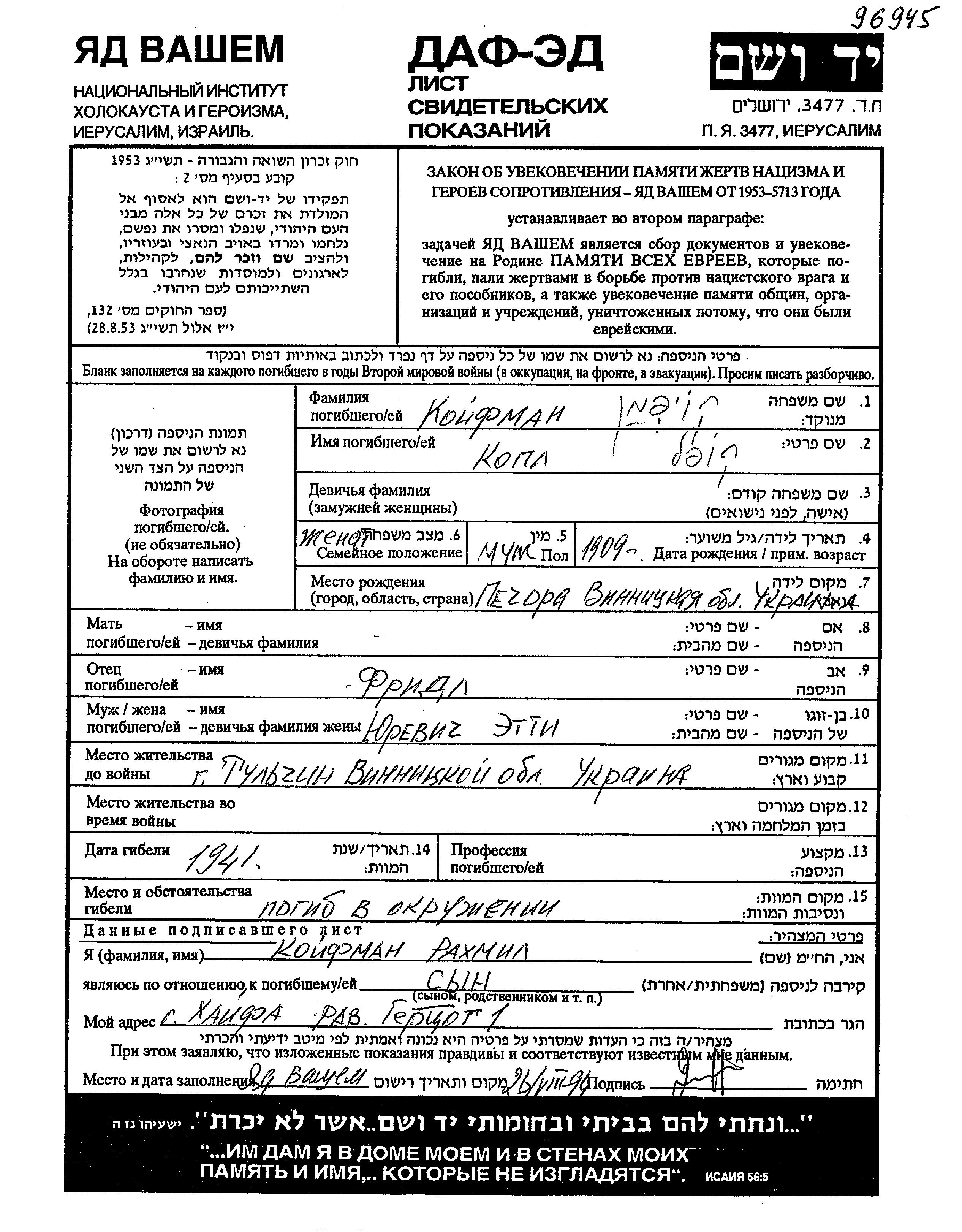 Kopl Koyfman wurde im Jahr 1909 in Pechora, Ukraine (UdSSR) geboren. Er war der Sohn von Fridl. Er war mit Eti Verheiratet. Vor dem Zweiten Weltkrieg lebte er in Tulchin, Ukraine (UdSSR). Während des Krieges war er in die Sowjetischen Streitkräfte.