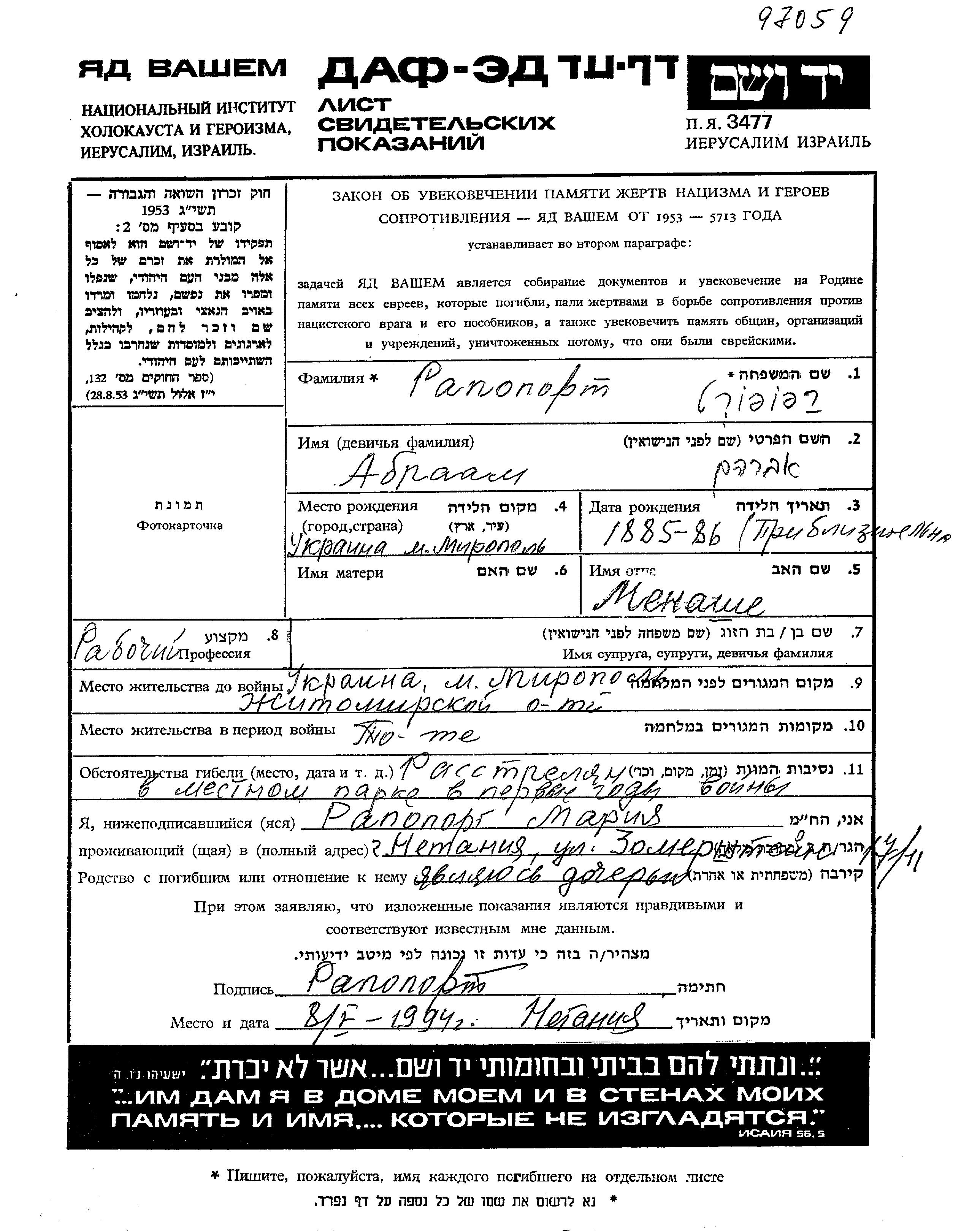 Abraam wurde in der Schoah ermordet. Todesort: Miropol, Ukraine (UdSSR).