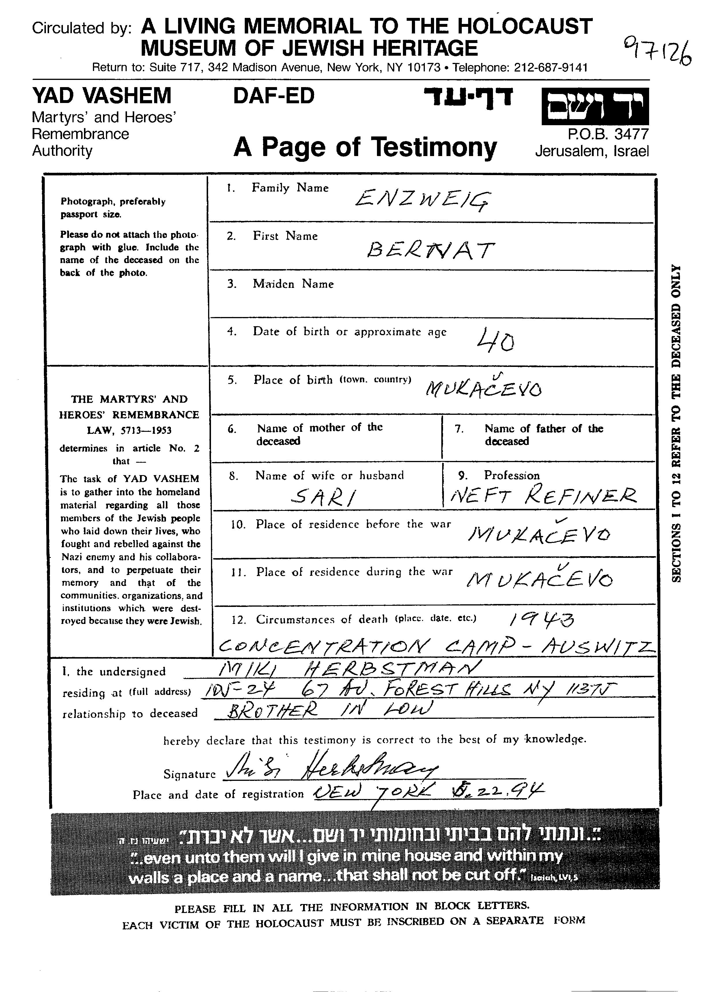 Bernat Enzweig wurde in Mukacevo, Tschechoslowakei geboren. Er war Techniker/-in und mit Sari Verheiratet. Vor dem Zweiten Weltkrieg lebte er in Mukacevo, Tschechoslowakei. Während des Krieges war er in Mukacevo, Tschechoslowakei.