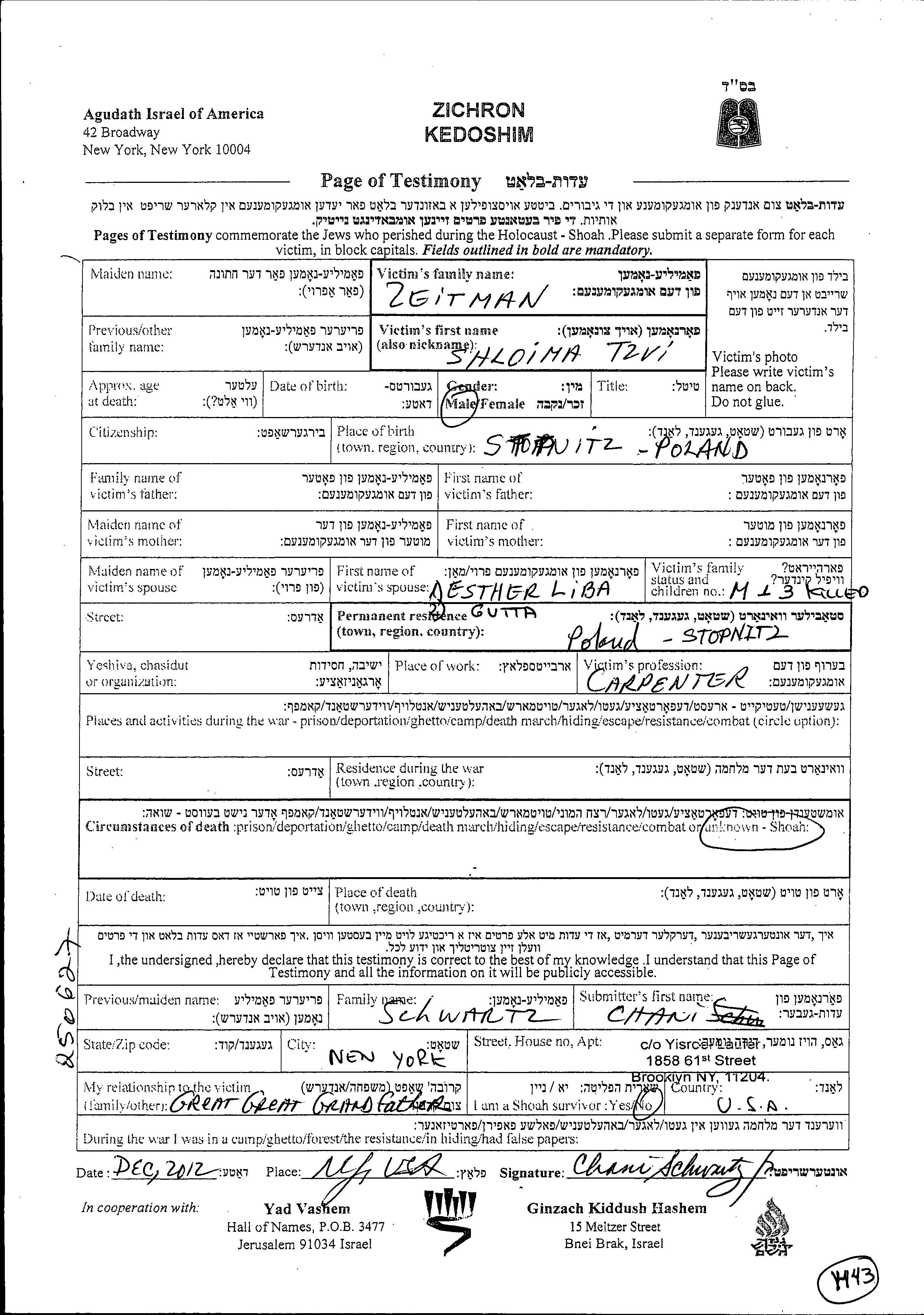 Shloima Tzvi Zeitman wurde in Stopnica, Polen geboren. Er war Zimmermann und mit Esther Liba Gutta Verheiratet. Vor dem Zweiten Weltkrieg lebte er in Stopnica, Polen.