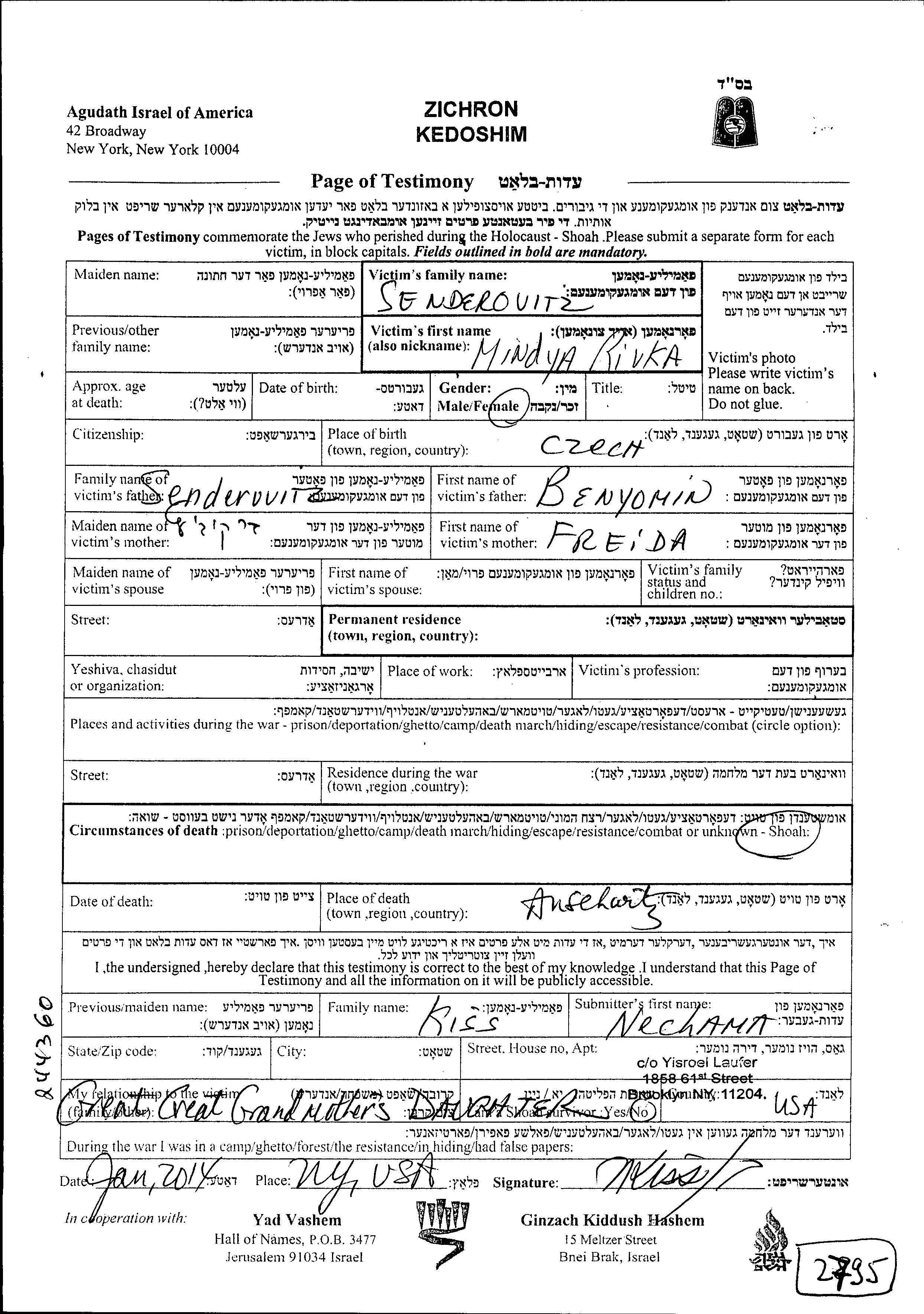 Senerovitz Mindya Rivka unbekannter Ort, Gedenkblatt