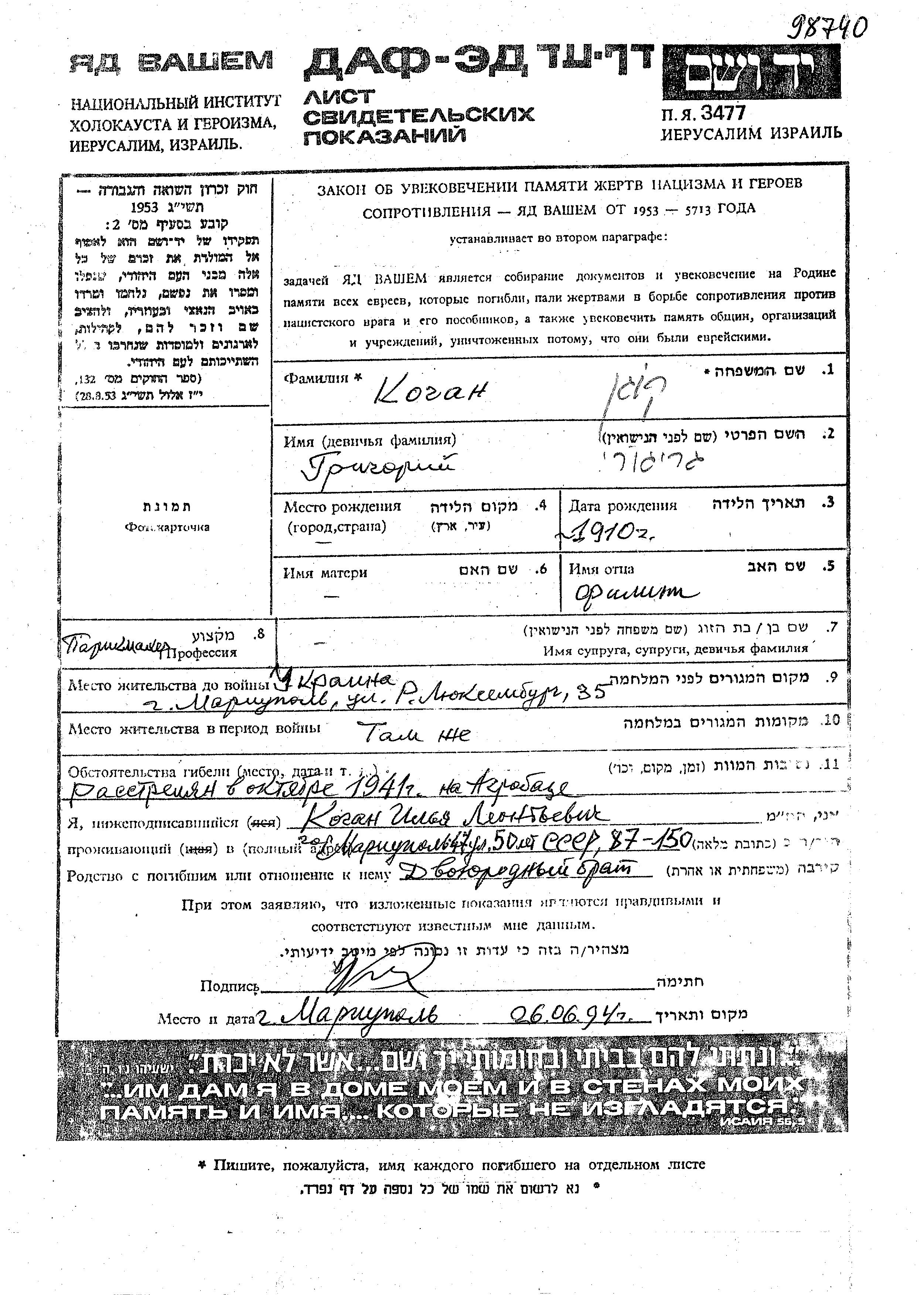 Grigori Kogan wurde im Jahr 1910 geboren. Er war der Sohn von Filip. Er war Friseur/-in. Vor dem Zweiten Weltkrieg lebte er in Mariupol, Ukraine (UdSSR). Während des Krieges war er in Mariupol, Ukraine (UdSSR).