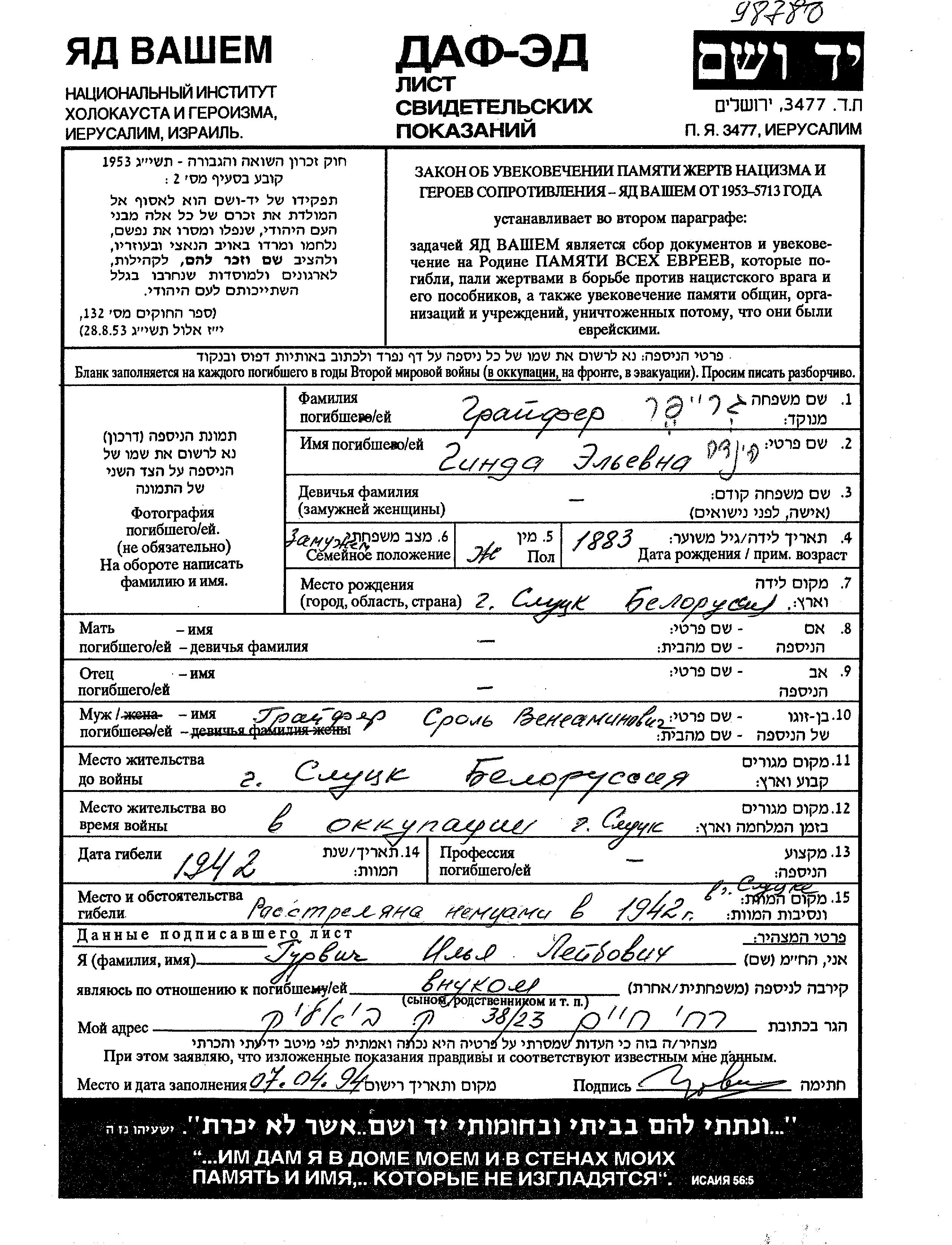 Ginda Graifer wurde im Jahr 1883 in Slutsk, Weißrussland (UdSSR) geboren. Sie war die Tochter von Elia Alia. Sie war mit Srol Verheiratet. Vor dem Zweiten Weltkrieg lebte sie in Slutsk, Weißrussland (UdSSR). Während des Krieges war sie in Slutsk, Weißrussland (UdSSR).